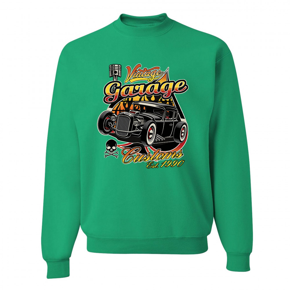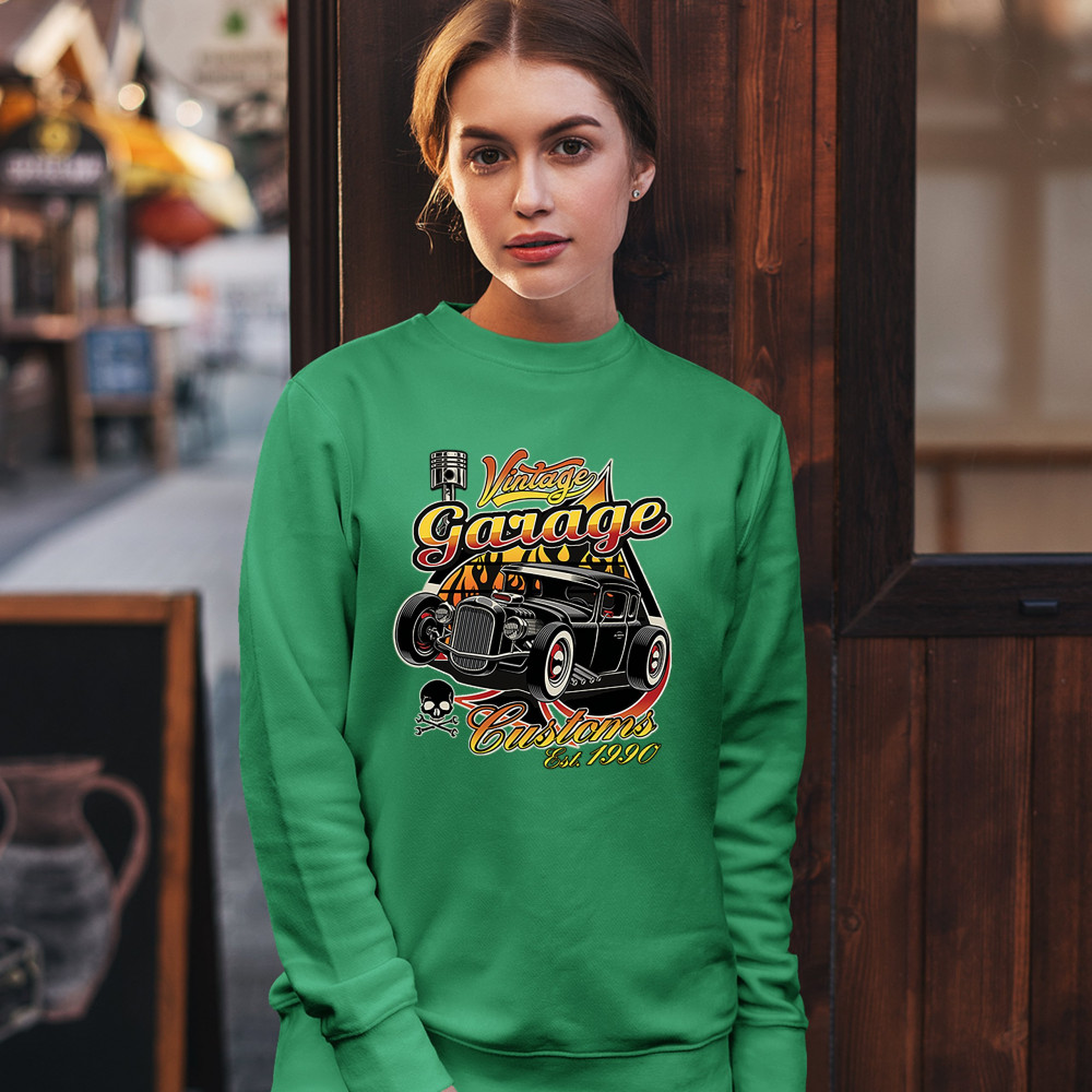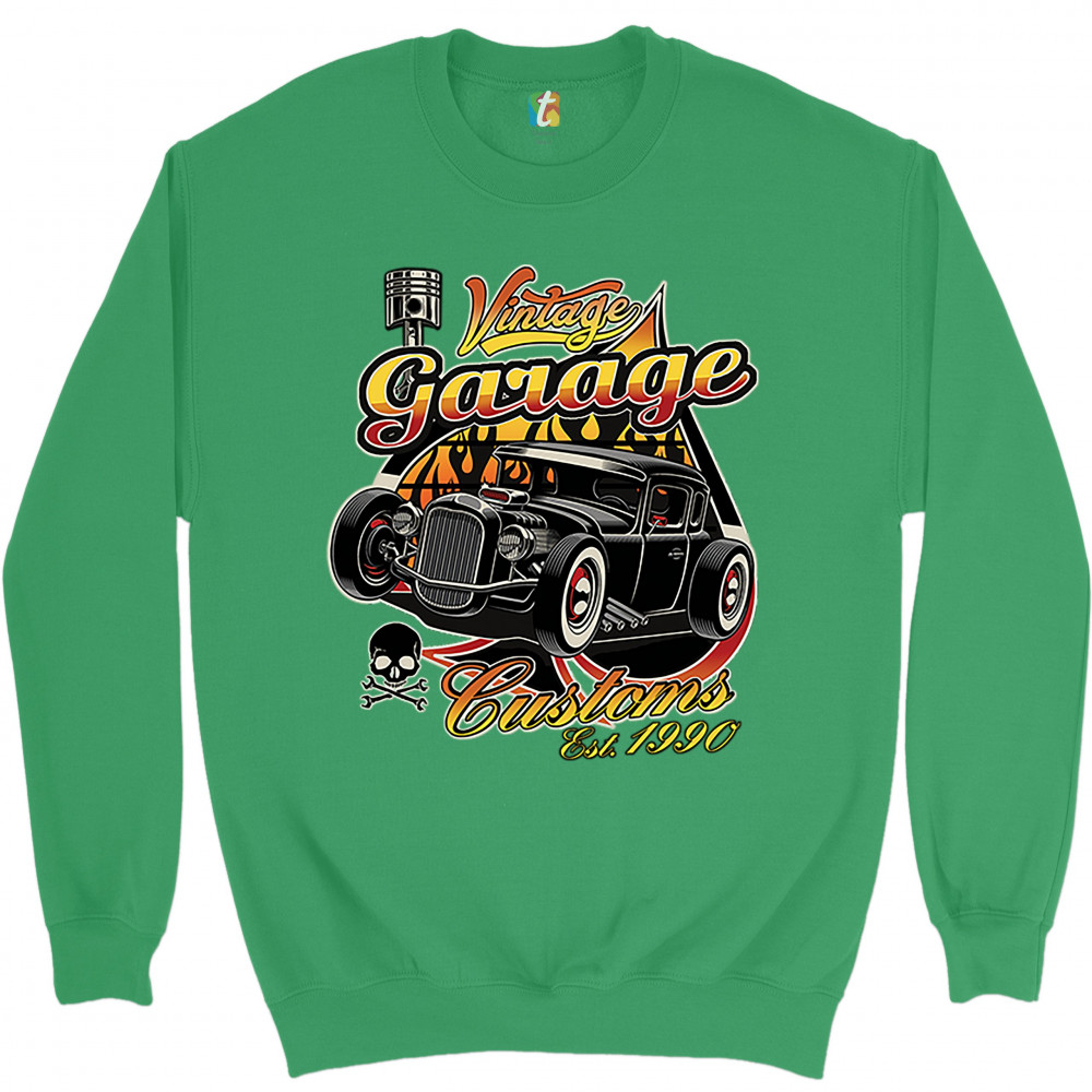 A print featuring a lowrider hot rod, a small skull with crossed wrenches instead of bones, a piston and an ace of spades in the background. The orint says: "Vintage Garage Customs Est. 1990". A great choice for a fan of customized American classic cars a