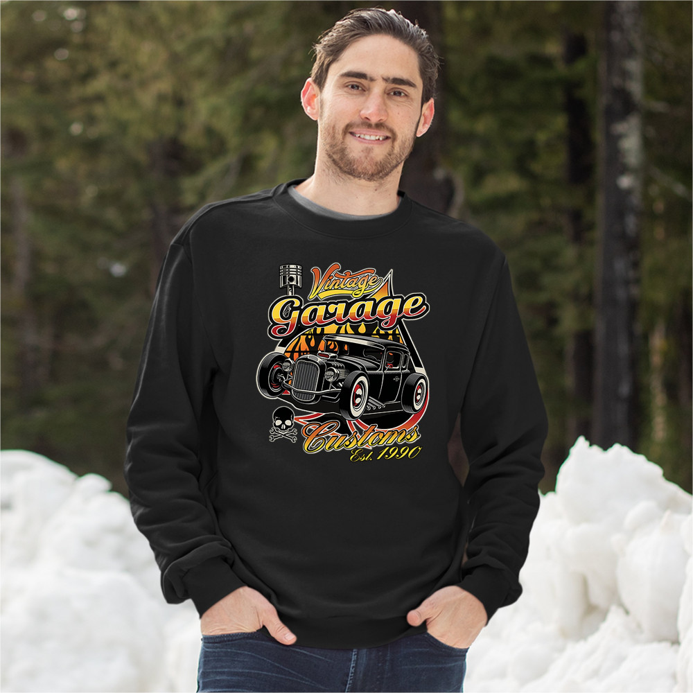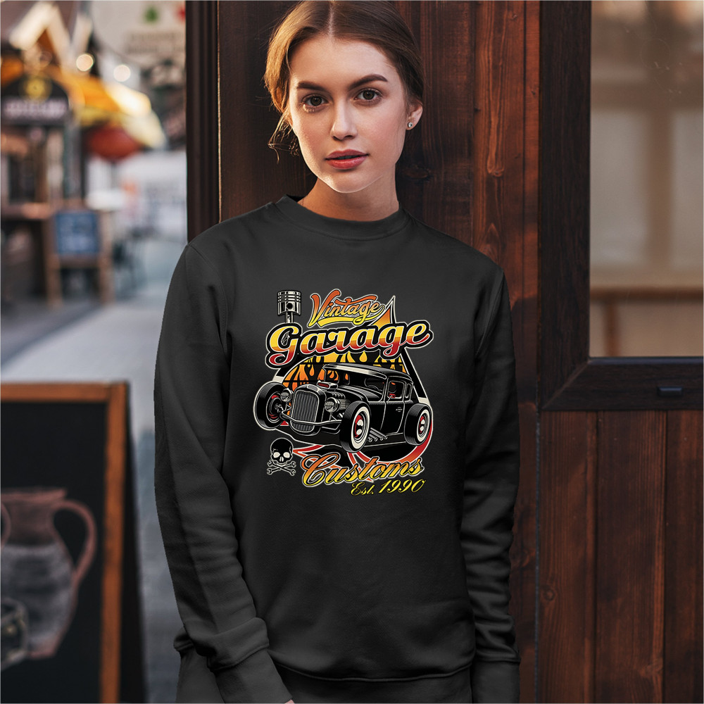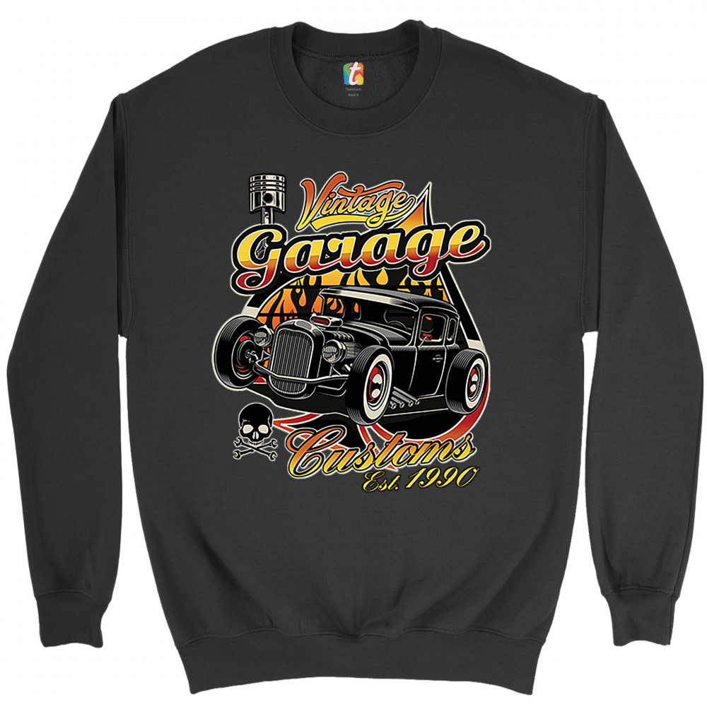 A print featuring a lowrider hot rod, a small skull with crossed wrenches instead of bones, a piston and an ace of spades in the background. The orint says: "Vintage Garage Customs Est. 1990". A great choice for a fan of customized American classic cars a