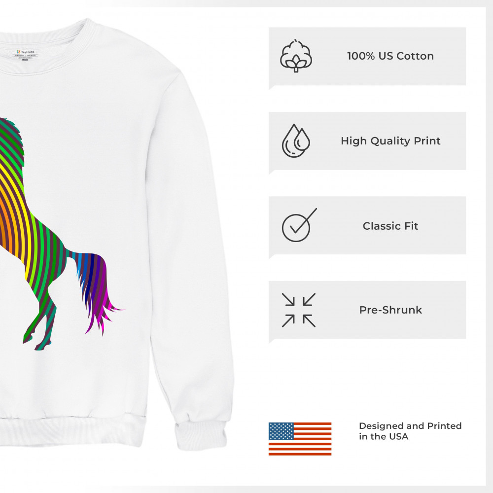 The print depicts a strong rearing unicorn. The unicorn is painted in vivid rainbow-stripe colors. This can symbolize a strong spirit of the sexual and gender minority.