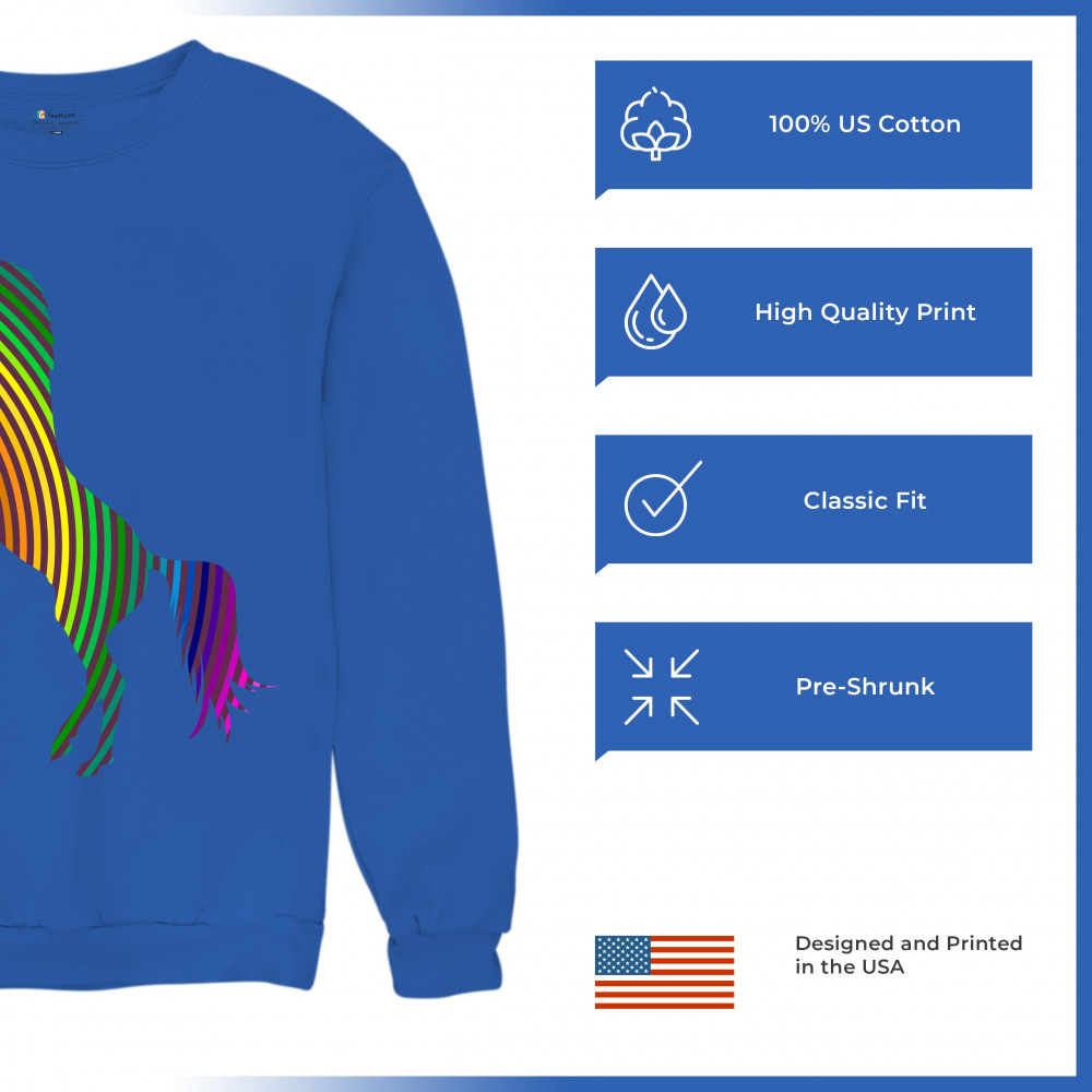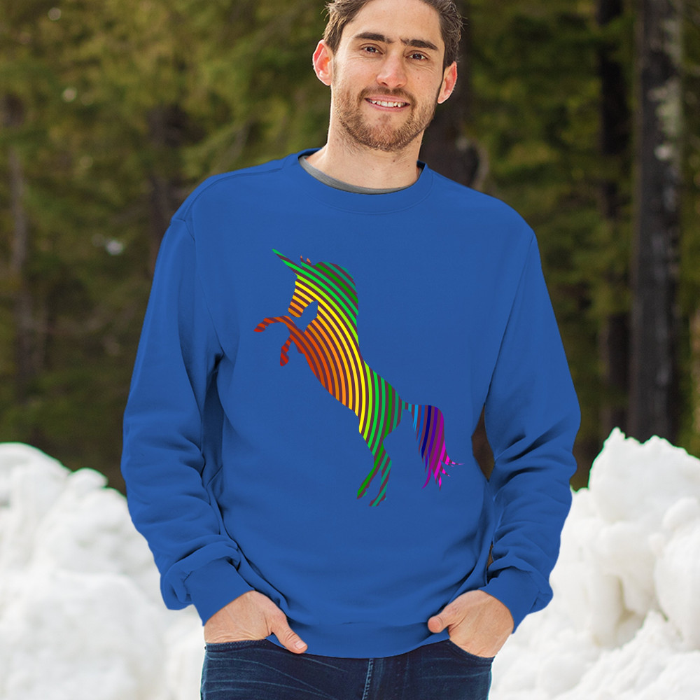 The print depicts a strong rearing unicorn. The unicorn is painted in vivid rainbow-stripe colors. This can symbolize a strong spirit of the sexual and gender minority.