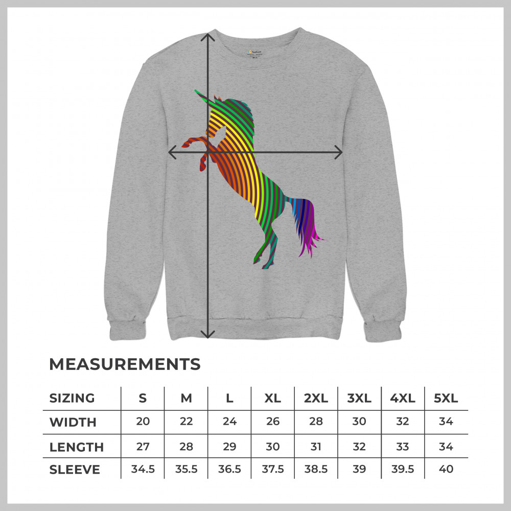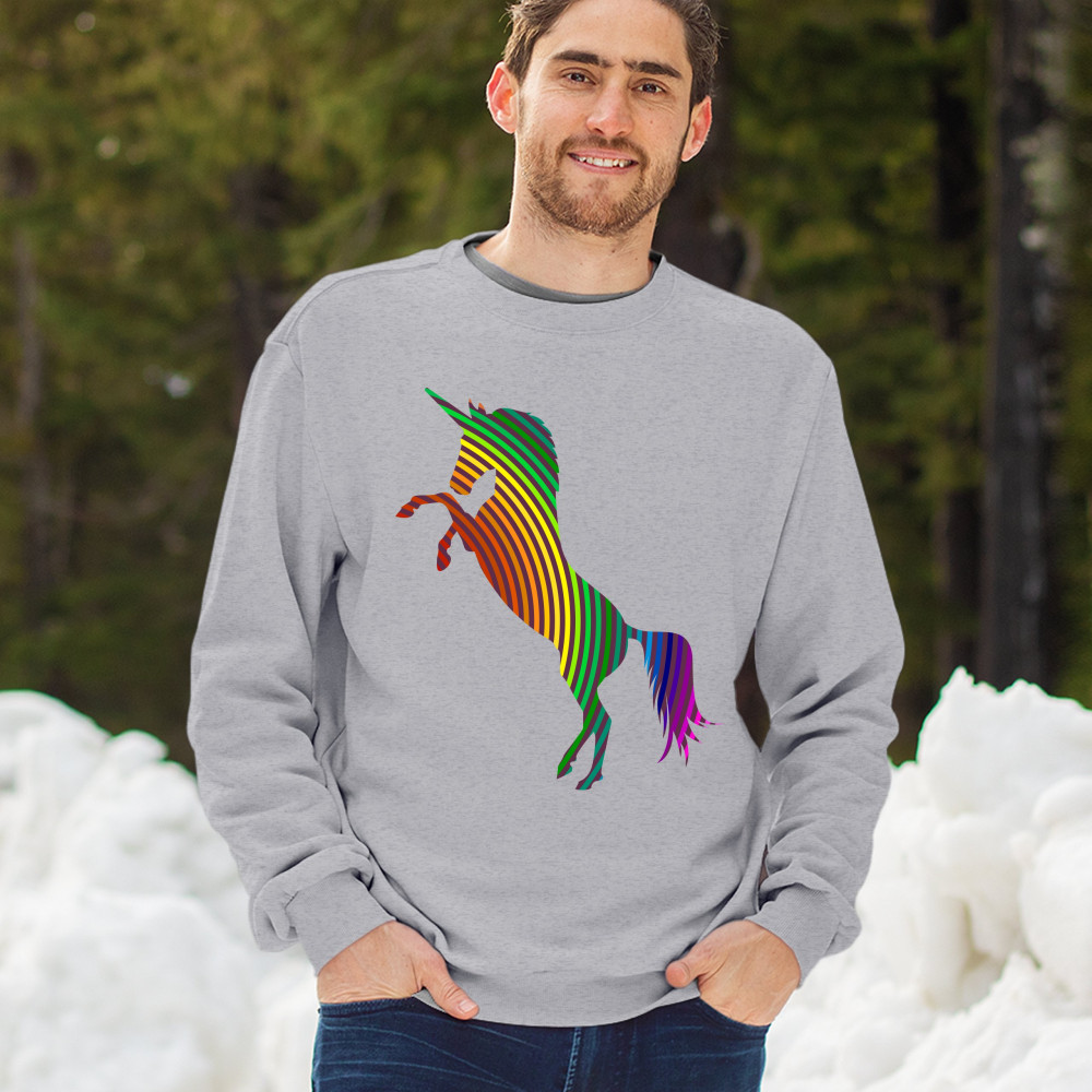 The print depicts a strong rearing unicorn. The unicorn is painted in vivid rainbow-stripe colors. This can symbolize a strong spirit of the sexual and gender minority.