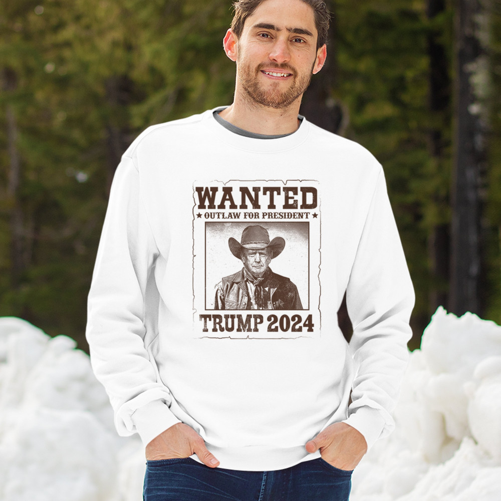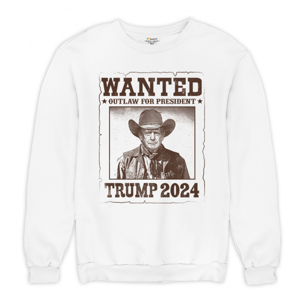 Bold "Wanted: Outlaw for President" design featuring Trump in cowboy attire, perfect for rally-goers and supporters. Express your support for the 2024 election.