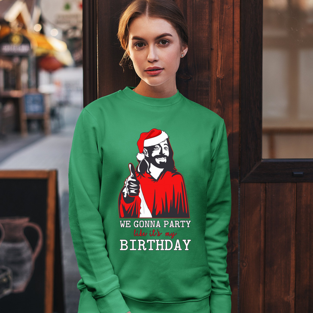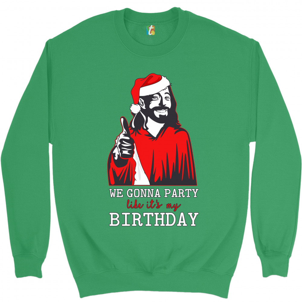 WE GONNA PARTY LIKE IT'S MY BIRTHDAY sweatshirt jesus christ xmas crewneck green