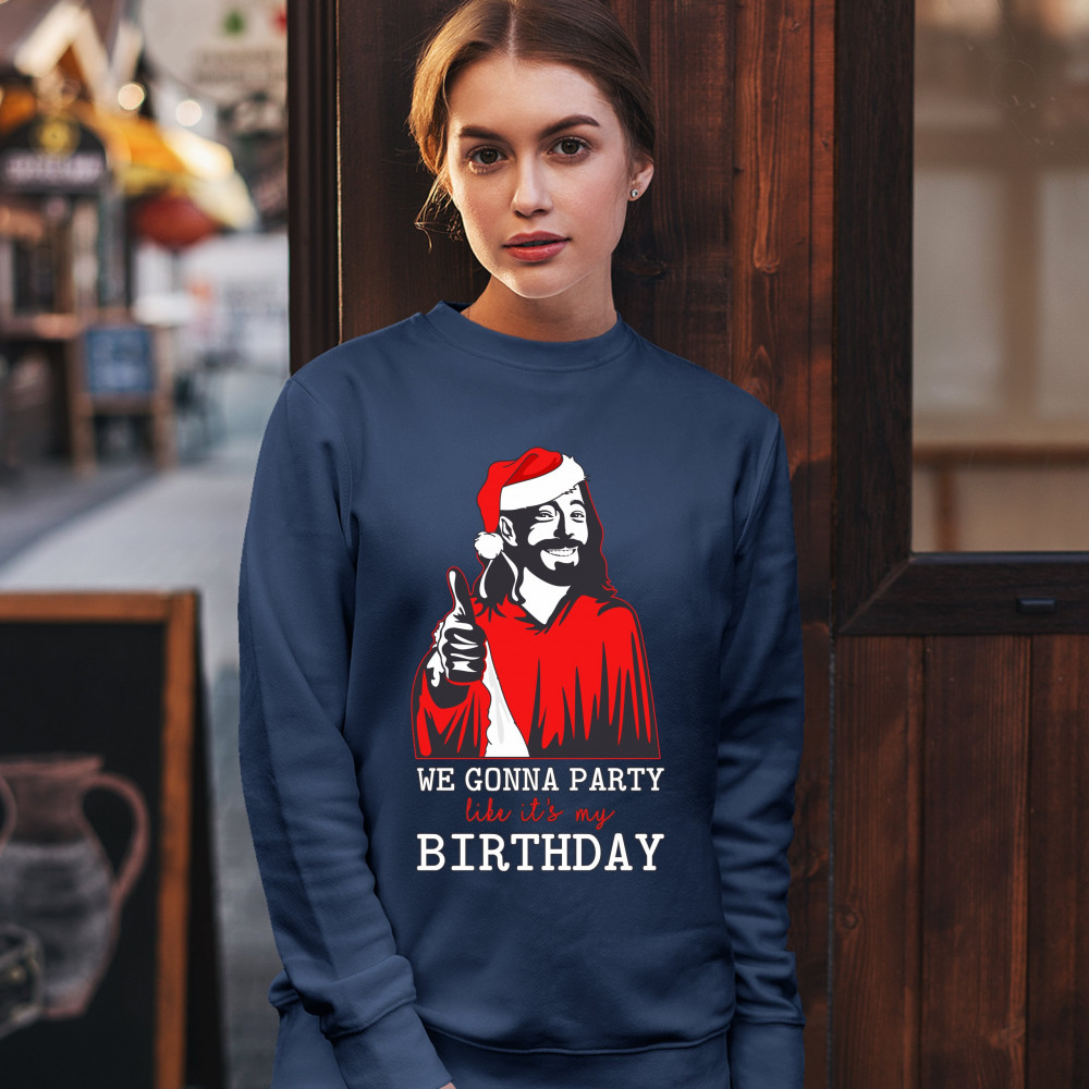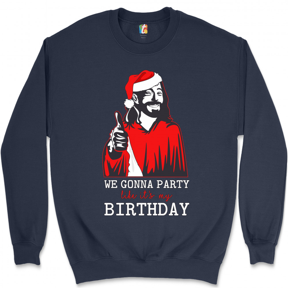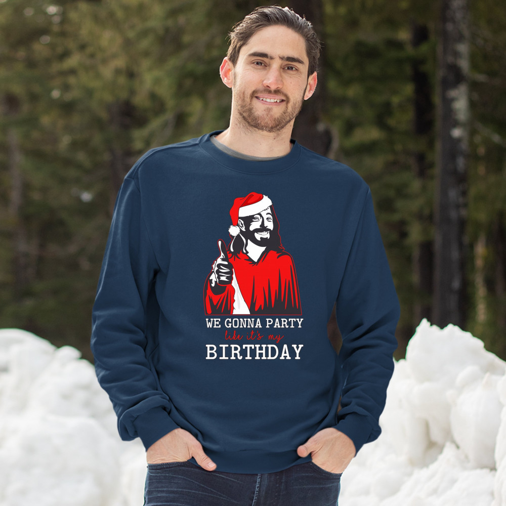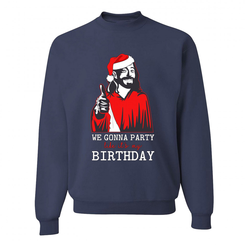 WE GONNA PARTY LIKE IT'S MY BIRTHDAY sweatshirt jesus christ xmas crewneck navy blue