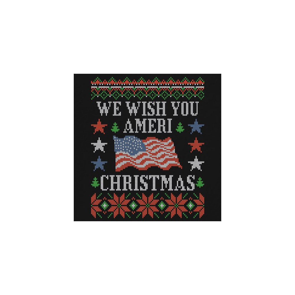 A print saying: "We Wish You Ameri Christmas" and featuring an American flag. The print is designed as an ugly sweater. Amazing choice to express your patriotism while celebrating Christmas.