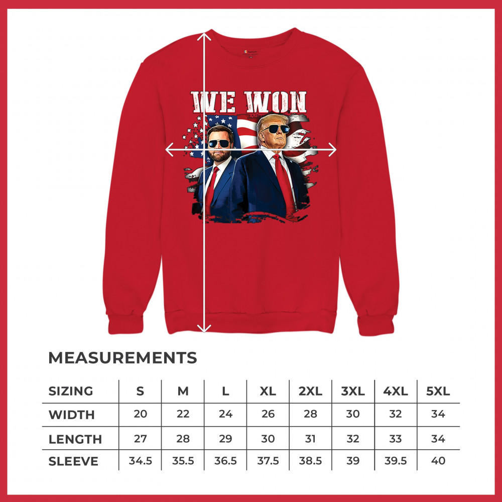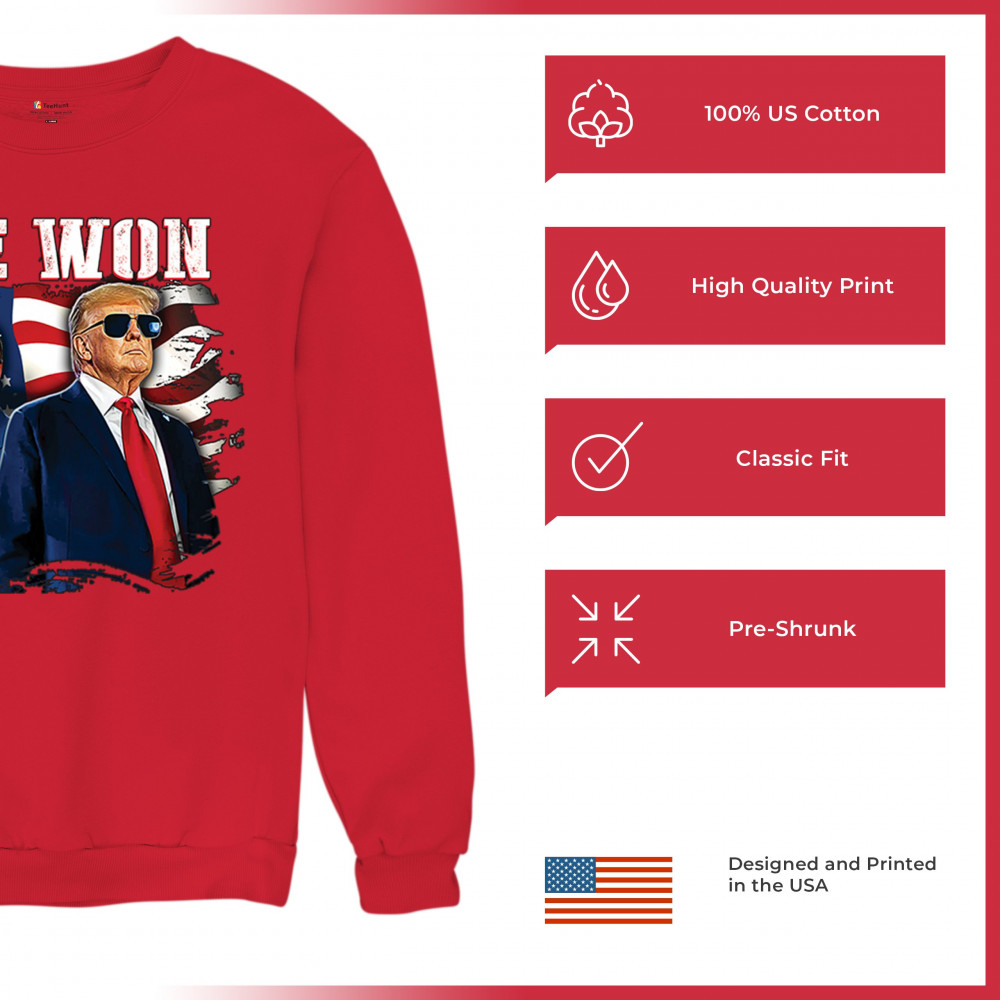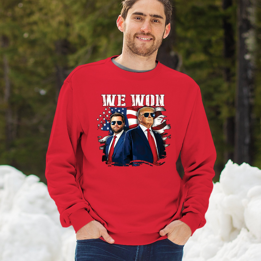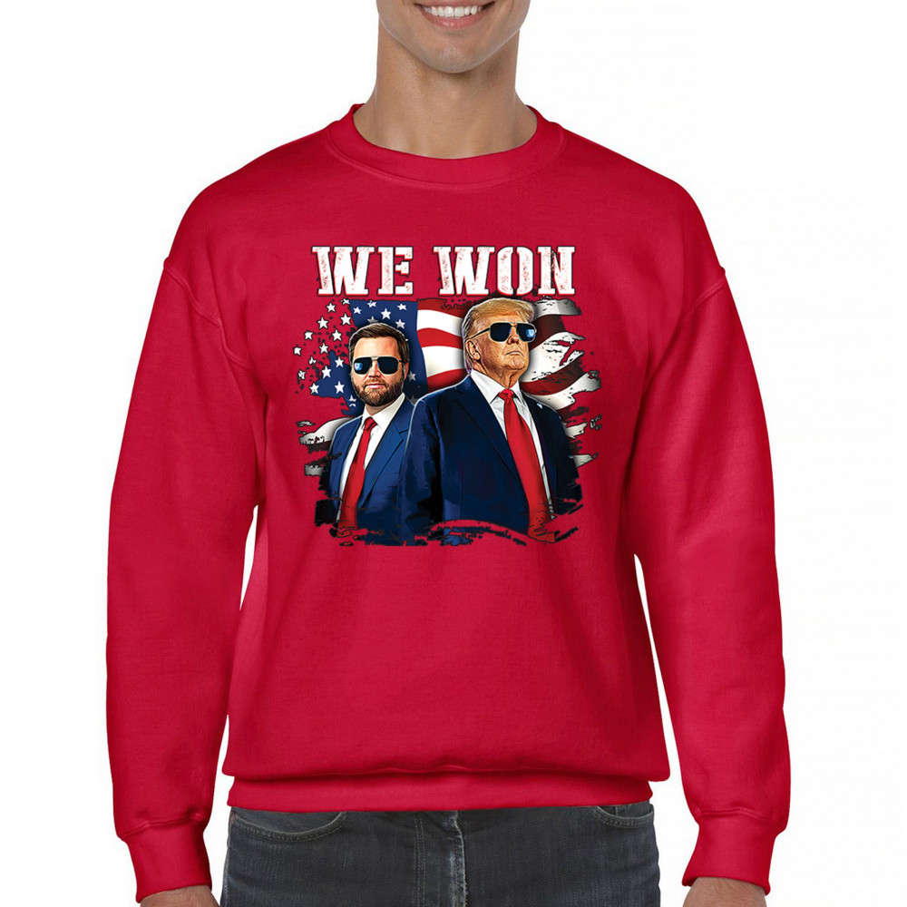 Celebrate Republican victory with this bold "We Won" design featuring Trump and patriotic flair—perfect for rallies, events, and patriotic pride.