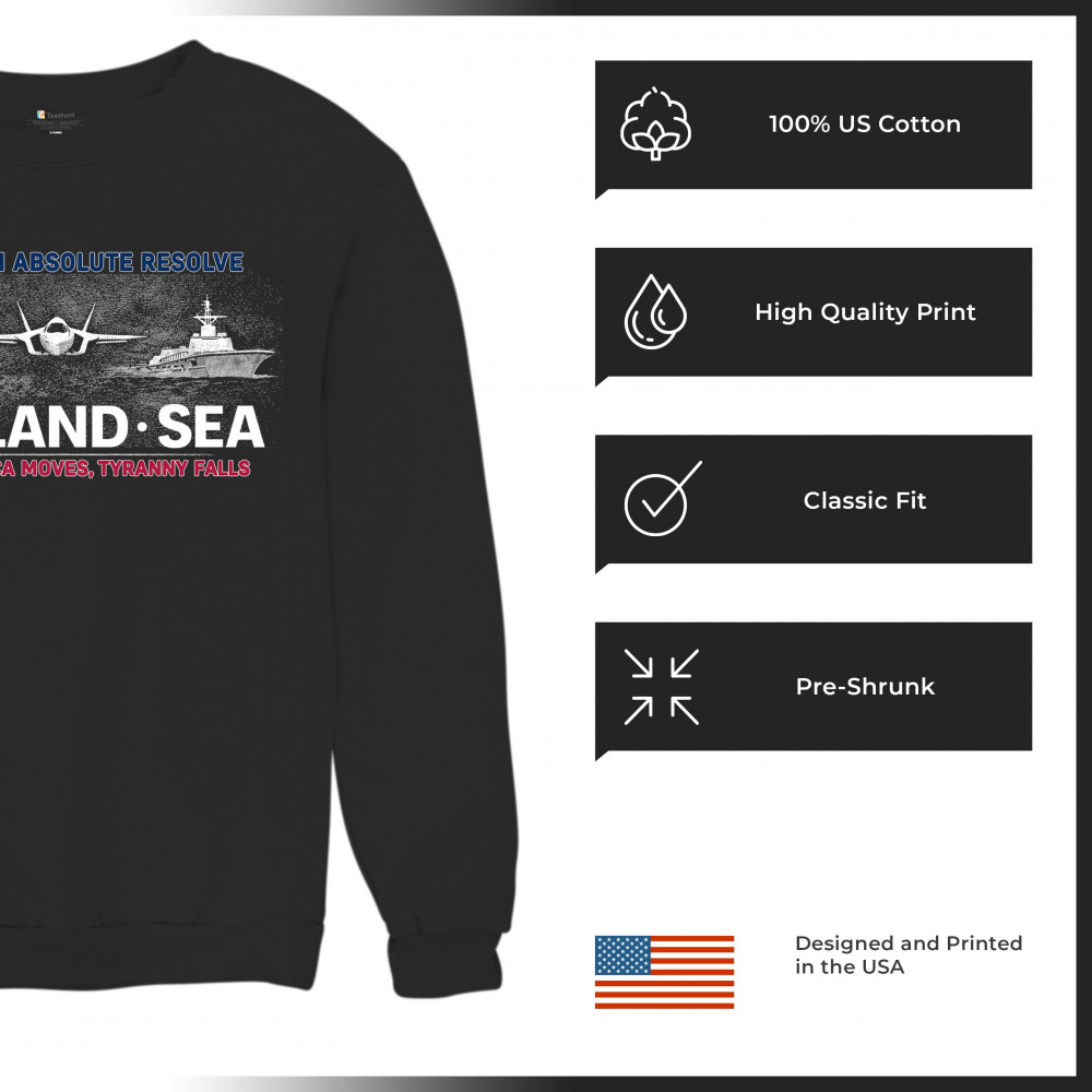 A striking patriotic graphic that combines air, land, and sea visuals to reflect coordination, resolve, and national strength. The design uses bold typography and classic military-inspired imagery without referencing specific people or conflicts. Created to feel powerful yet timeless, it works well for patriotic gatherings, heritage moments, and everyday wear.