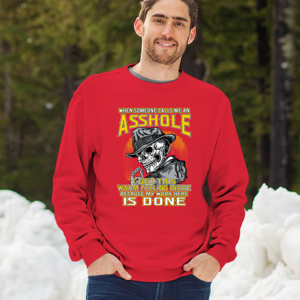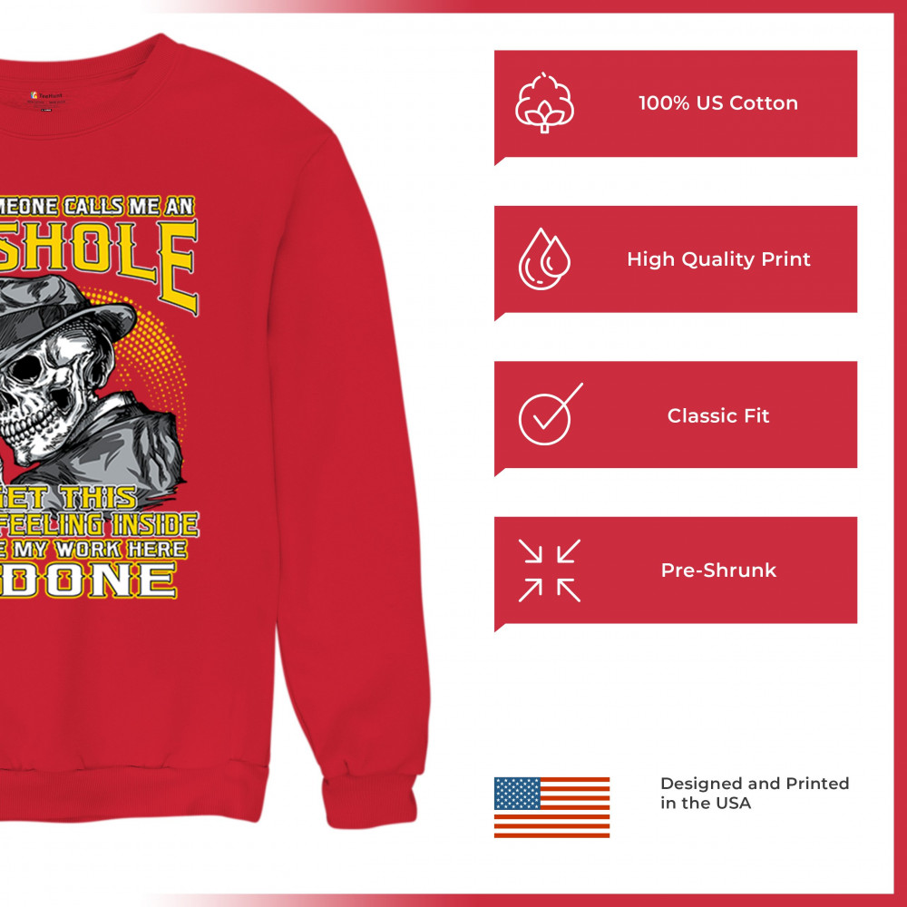 This badass design features a smirking skull in a fedora with a cigarette, backed by the line: “When someone calls me an asshole... my work here is done.†Built for dark humor fans, skull art lovers, and those who live life with sharp wit and zero regrets. Ideal for biker rallies, sarcasm nights, or anyone owning their attitude with pride.