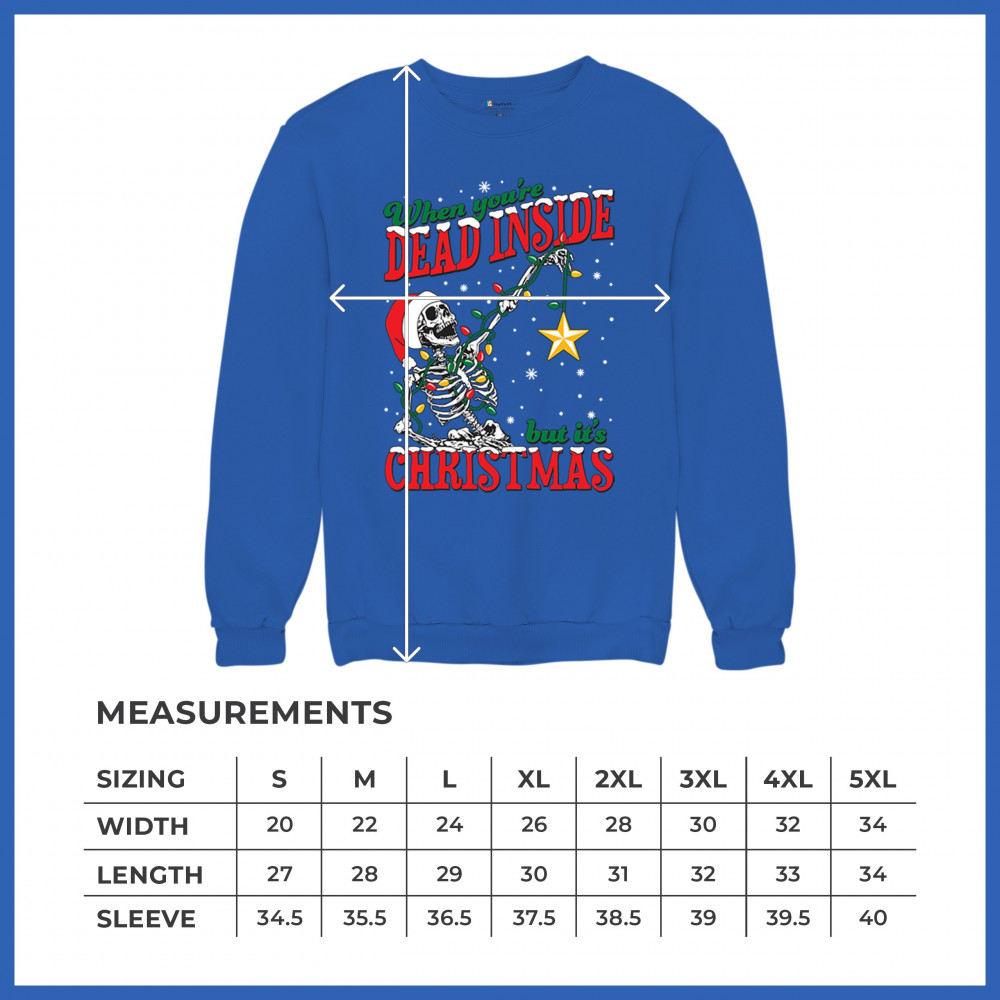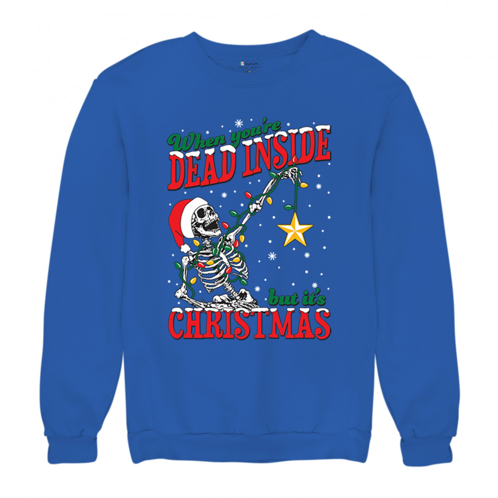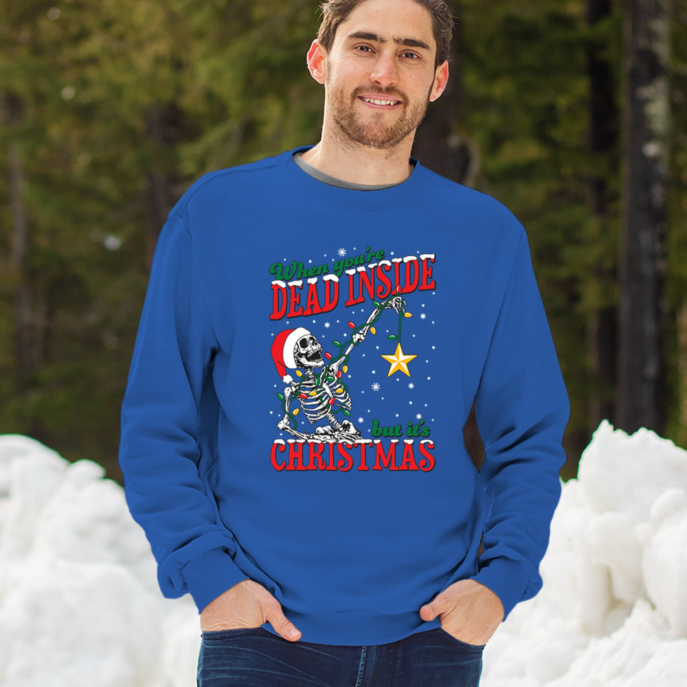 Bring humor and uniqueness to your holiday wardrobe with the "When You're Dead Inside But It's Christmas" design. This quirky creation features a skeleton embracing the festive spirit with colorful lights, a Santa hat, and a glowing star. Ideal for Secret Santa exchanges, ugly sweater parties, or anyone who loves blending a touch of humor with Christmas tradition. Celebrate the season in style with this unforgettable design.