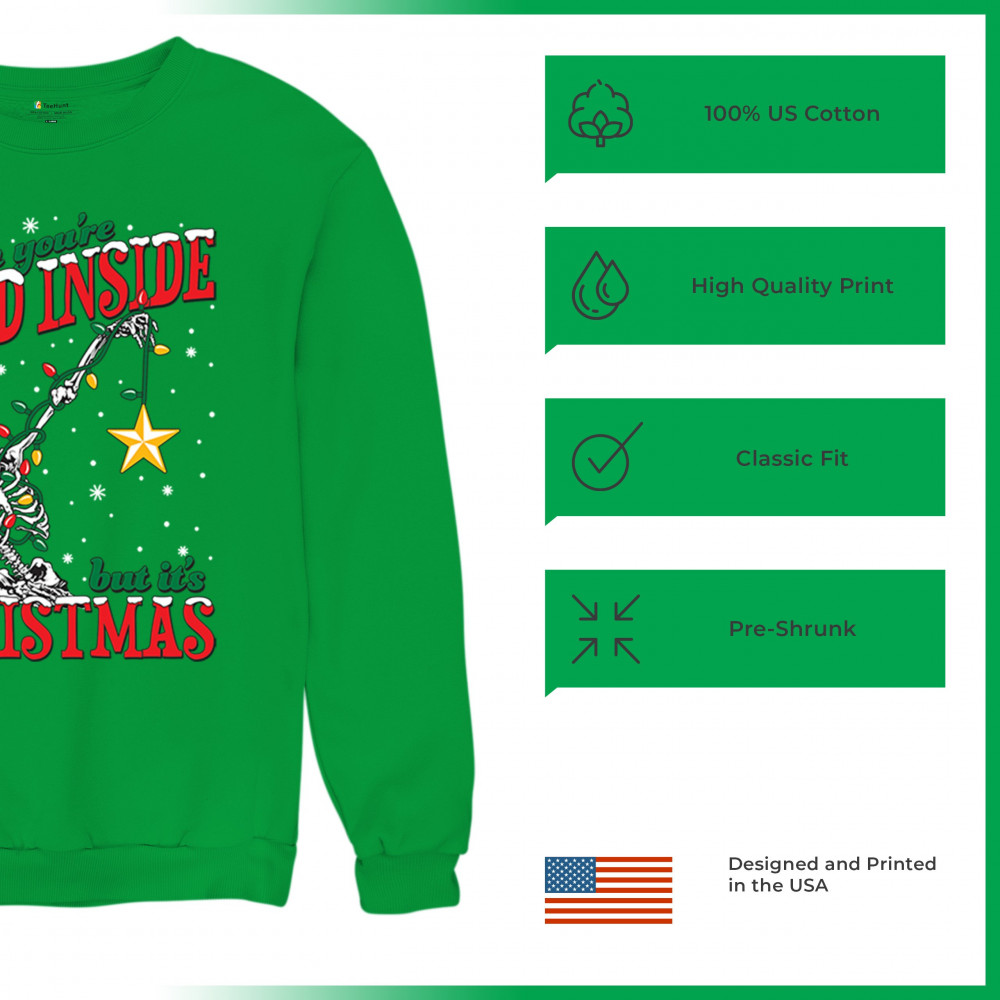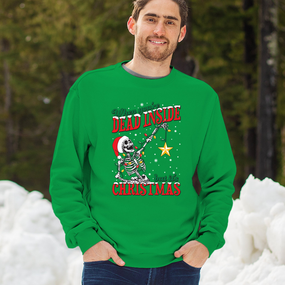 Bring humor and uniqueness to your holiday wardrobe with the "When You're Dead Inside But It's Christmas" design. This quirky creation features a skeleton embracing the festive spirit with colorful lights, a Santa hat, and a glowing star. Ideal for Secret Santa exchanges, ugly sweater parties, or anyone who loves blending a touch of humor with Christmas tradition. Celebrate the season in style with this unforgettable design.