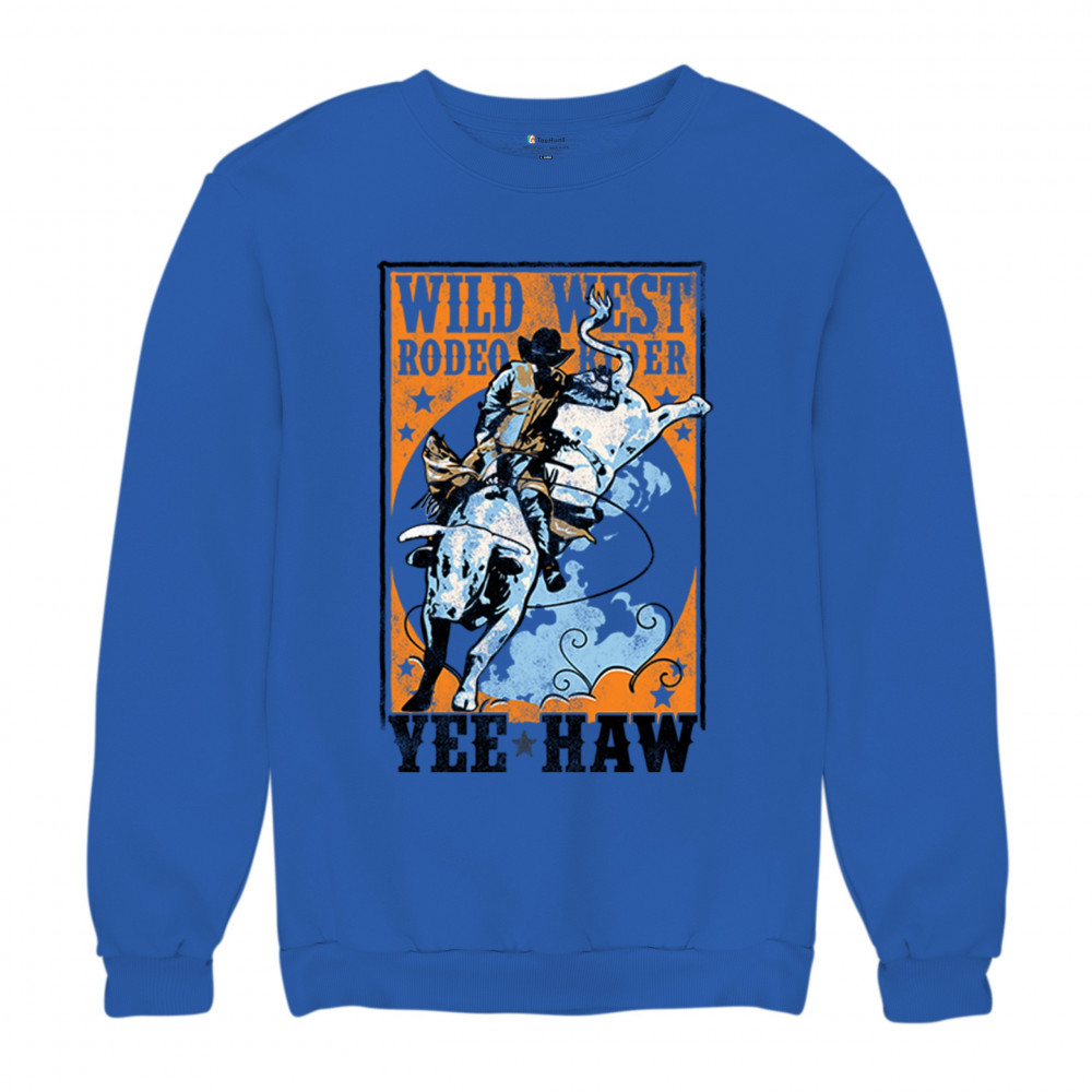 Bold cowboy bull riding design with orange backdrop, perfect for rodeo fans, western events, and country festivals.