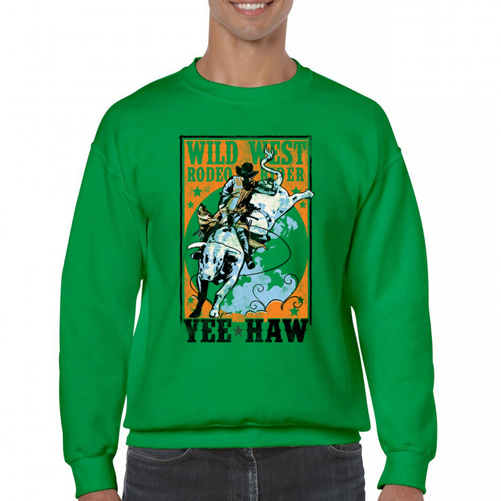 Bold cowboy bull riding design with orange backdrop, perfect for rodeo fans, western events, and country festivals.