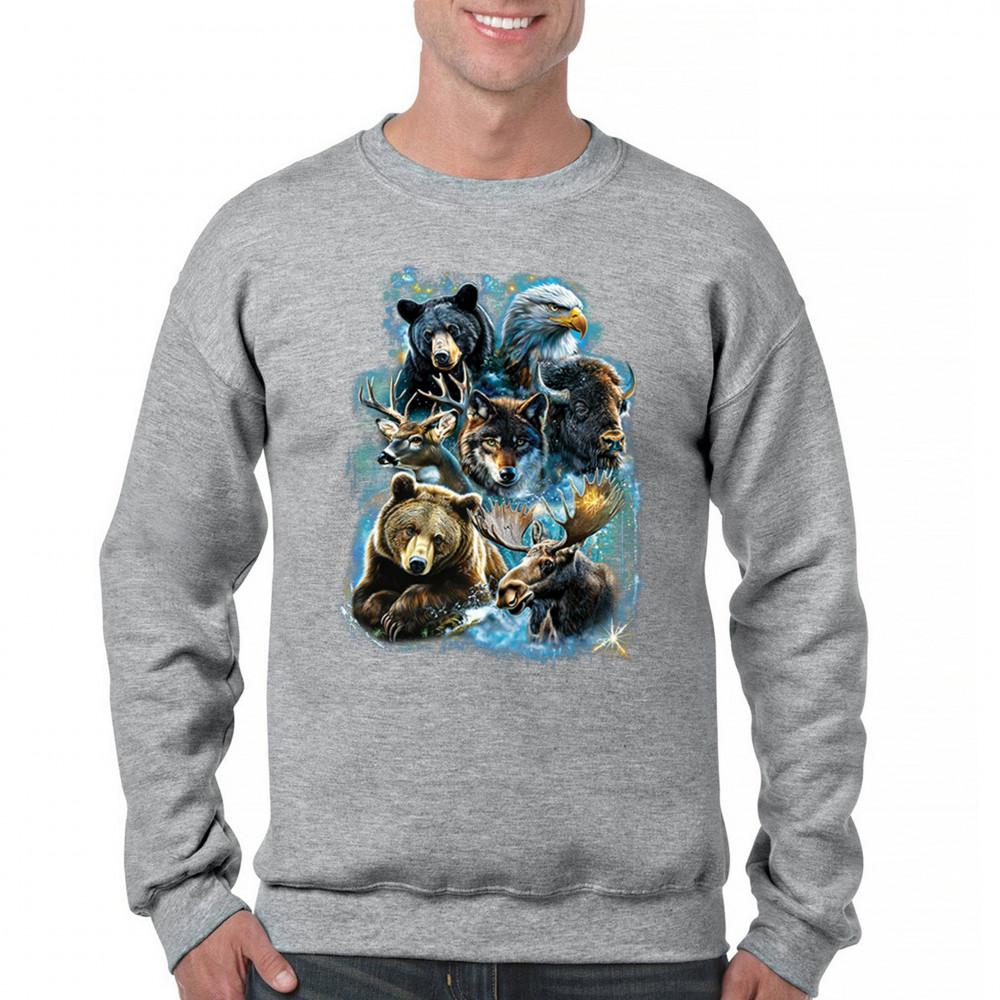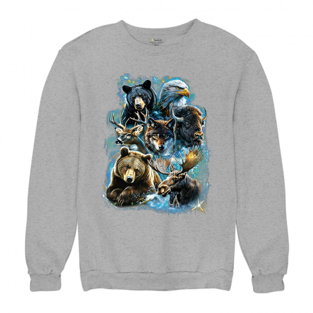 Wilderness design with moose, bear, eagle, bison, and wolf. A bold tribute to forest animals, nature strength, and rugged outdoor spirit.