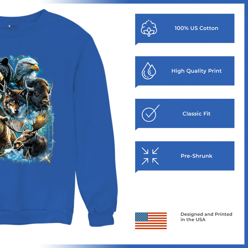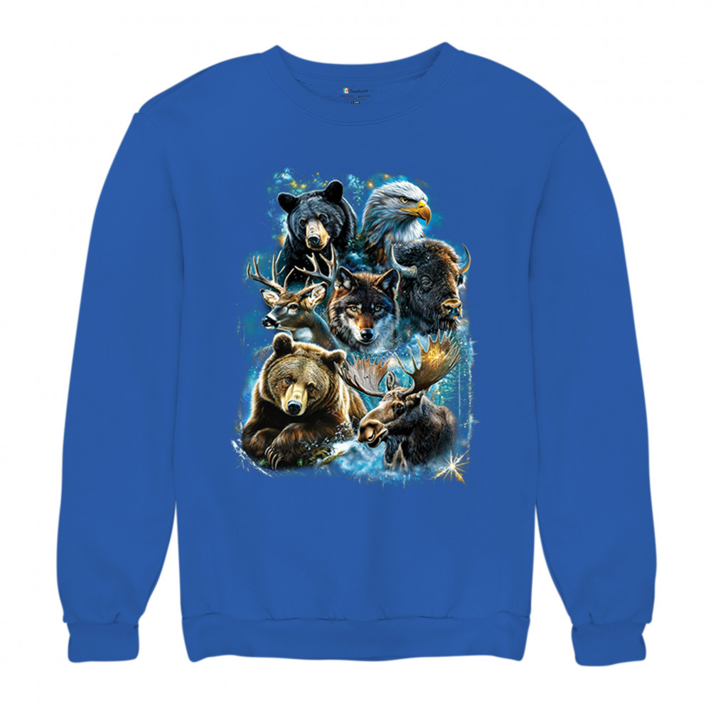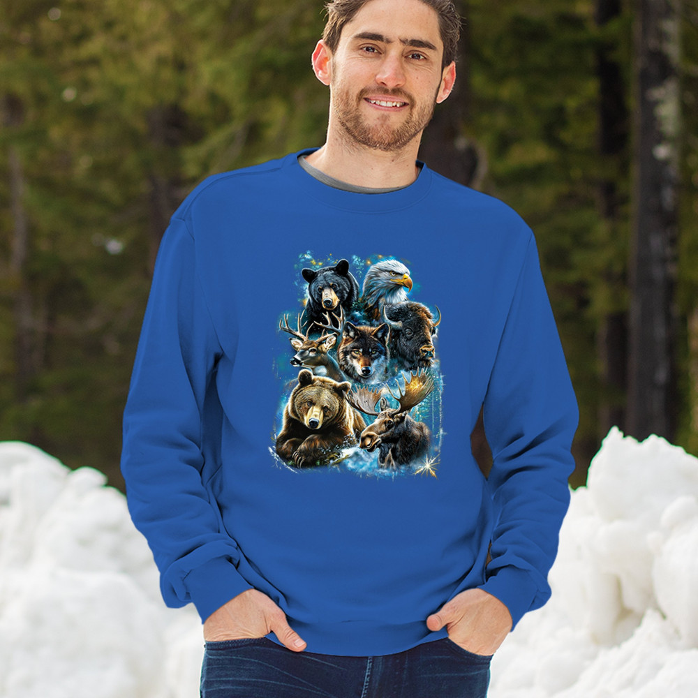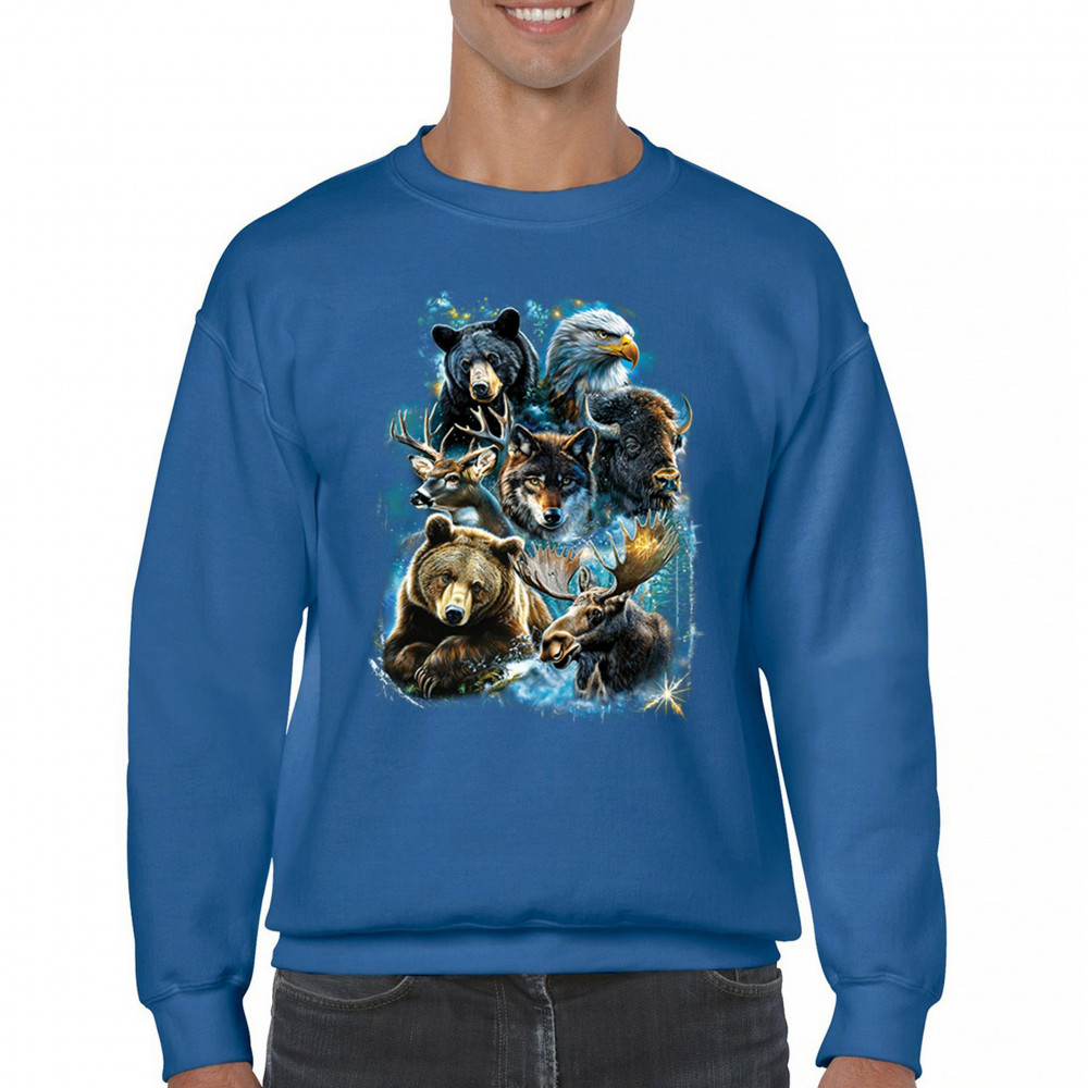 Wilderness design with moose, bear, eagle, bison, and wolf. A bold tribute to forest animals, nature strength, and rugged outdoor spirit.