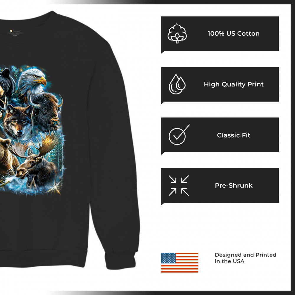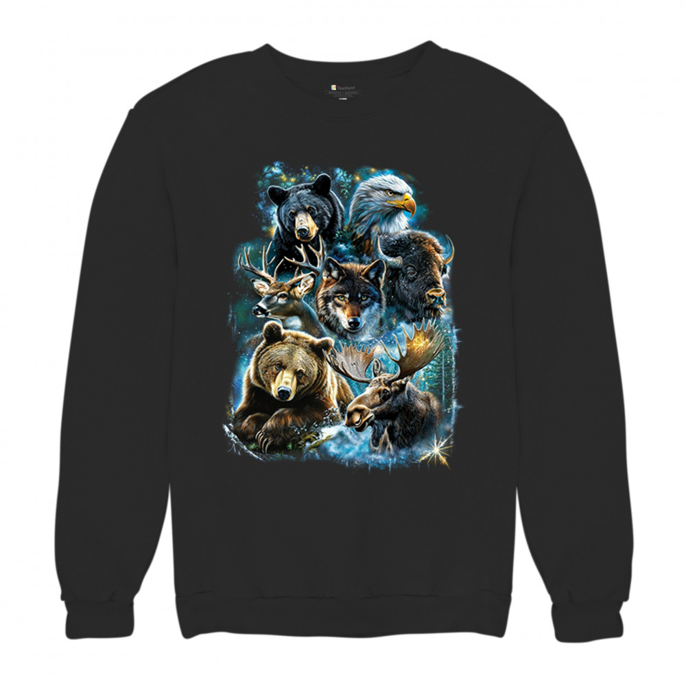 WILDLIFE COLLAGE sweatshirt animal nature lovers wolf moose forest crewneck black
