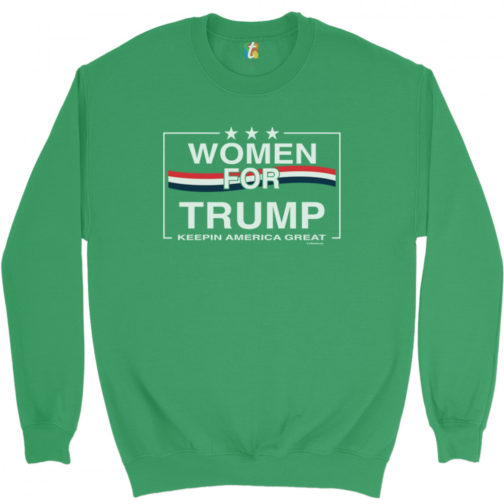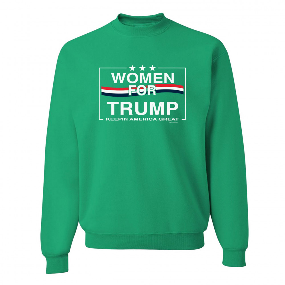 A political print saying "Women for Trump keepin America great". There are three stars above the caption and in the background there is a three-colored stripe. A great choice to wear for a Trump rally or give as a gift to a Donald Trump and Mike Pence supporter before 2020 presidential elections.