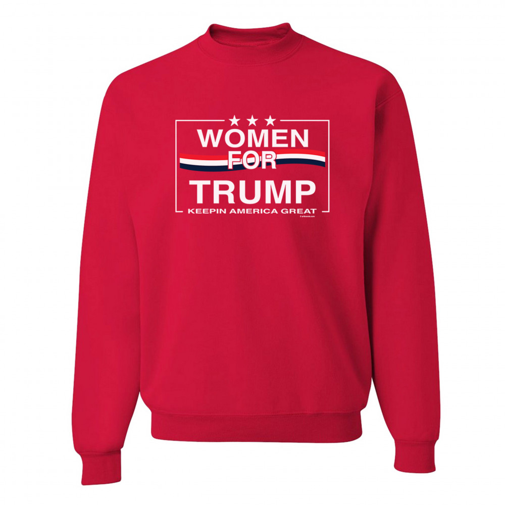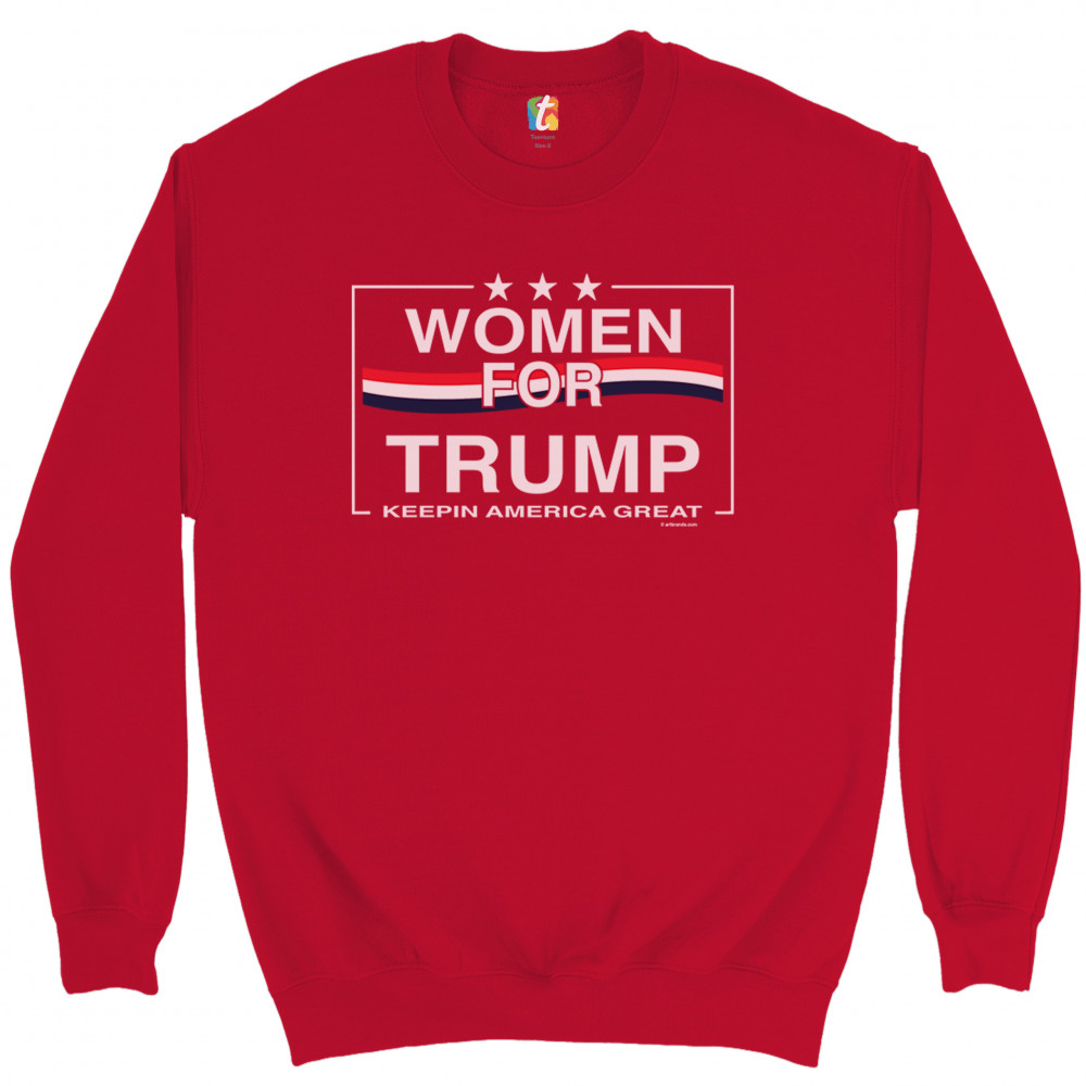 A political print saying "Women for Trump keepin America great". There are three stars above the caption and in the background there is a three-colored stripe. A great choice to wear for a Trump rally or give as a gift to a Donald Trump and Mike Pence supporter before 2020 presidential elections.