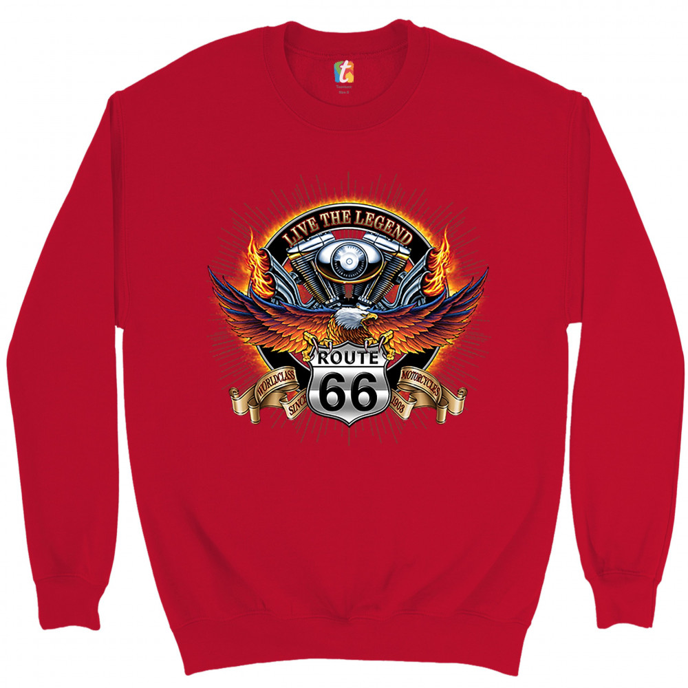A print featuring an American bald eagle spreading it's wings while sitting on a "Route 66" sign. On a stripe behind the sign it says: "worldclass motorcycles since 1903". In the background there is a motorcycle engine with words: "live the legend" above