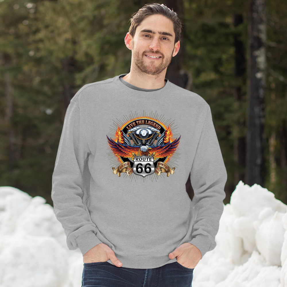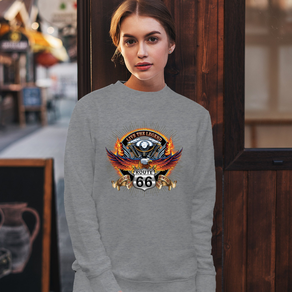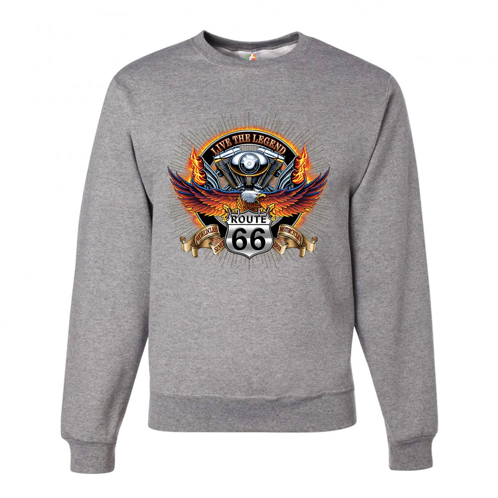 A print featuring an American bald eagle spreading it's wings while sitting on a "Route 66" sign. On a stripe behind the sign it says: "worldclass motorcycles since 1903". In the background there is a motorcycle engine with words: "live the legend" above
