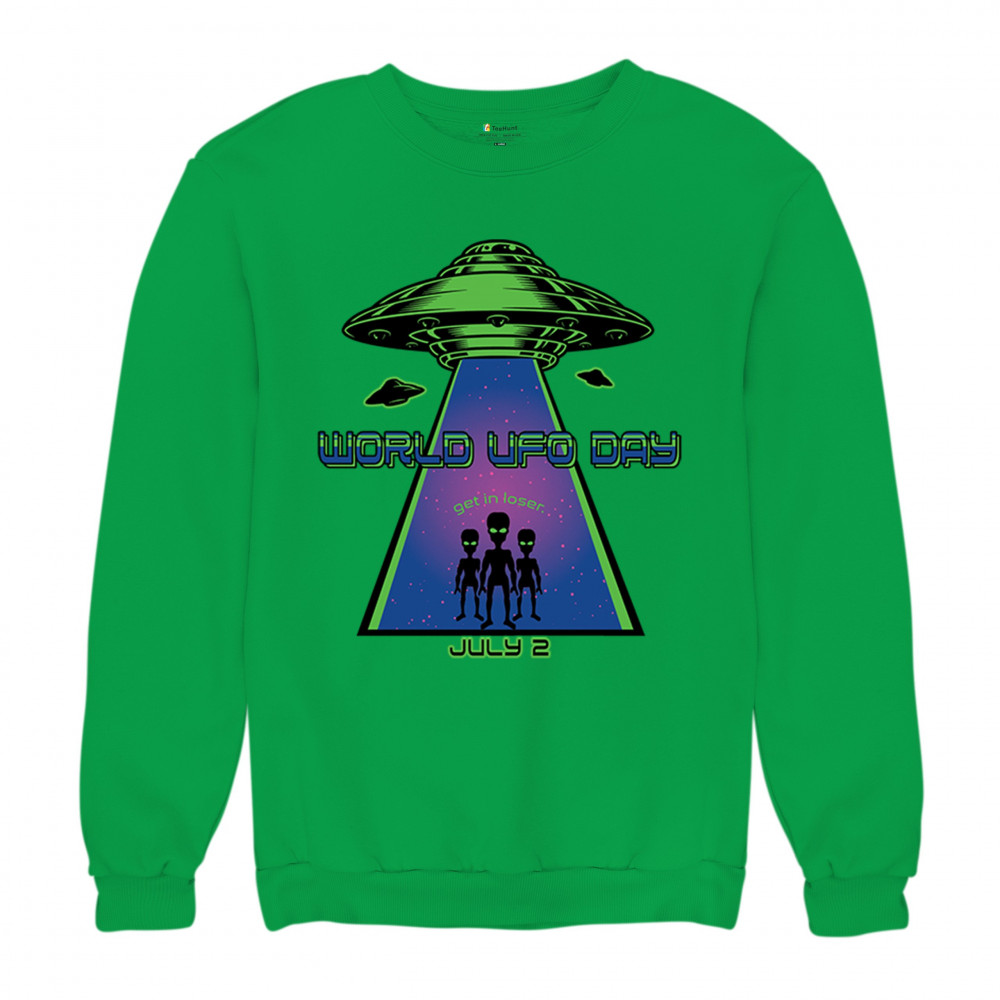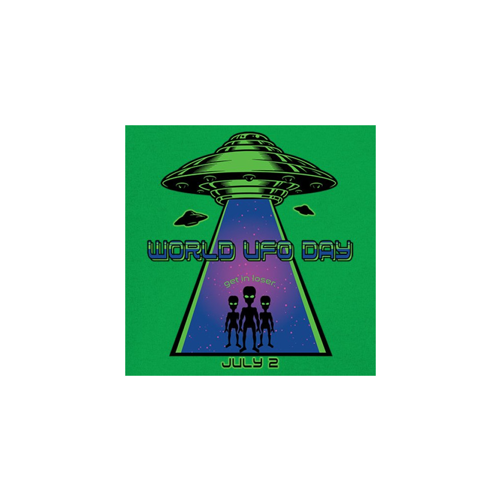 Celebrate World UFO Day with a vibrant design featuring a UFO and three playful aliens with "Get in, loser." Perfect for UFO enthusiasts and alien humor lovers.