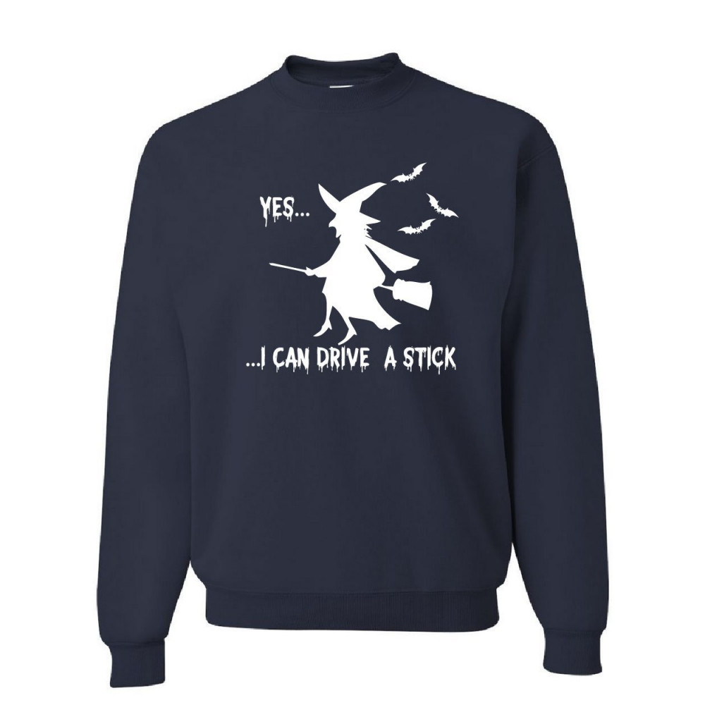 YES, I CAN DRIVE A STICK crew neck sweatshirt funny halloween witch navy blue