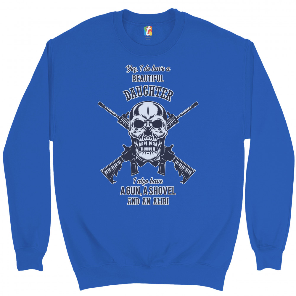 A funny print featuring a scary skull facing forward; behind it there are two crossed rifles. The print says: "Yes, I do have a beautiful daughter. I also have a gun, a shovel and an alibi". Great choice as a gift for Father's Day celebration.
