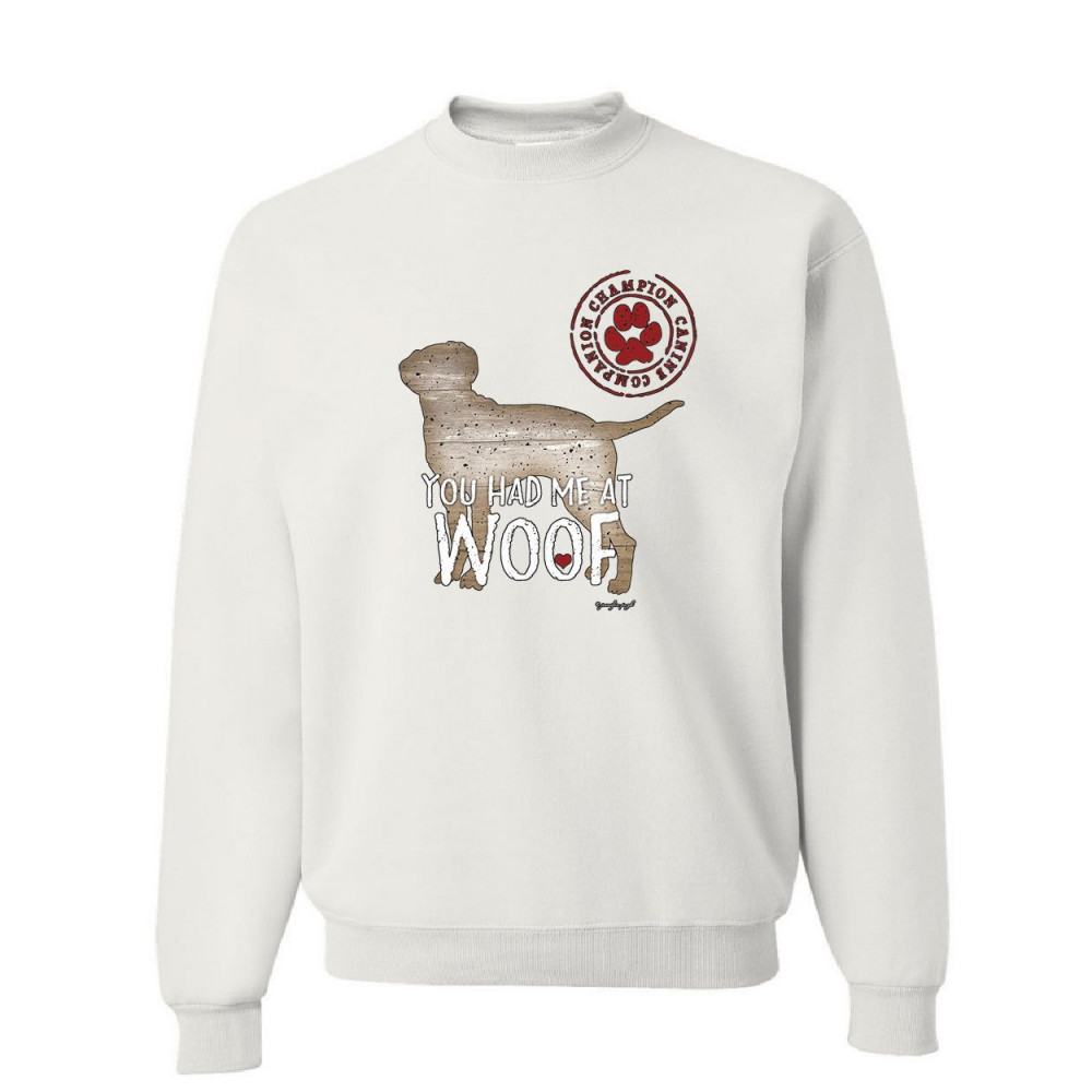 YOU HAD ME AT WOOF sweatshirt pet friend dogs doggie puppy paw bark sweater white