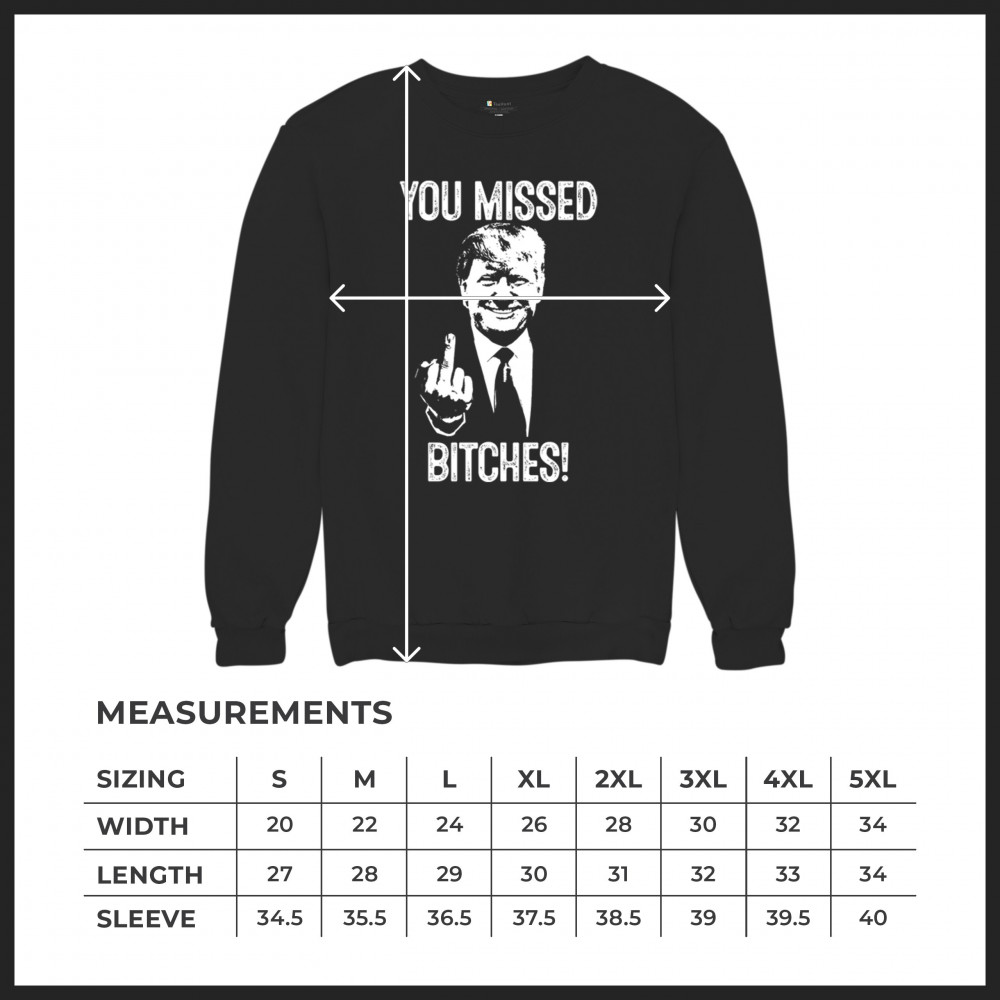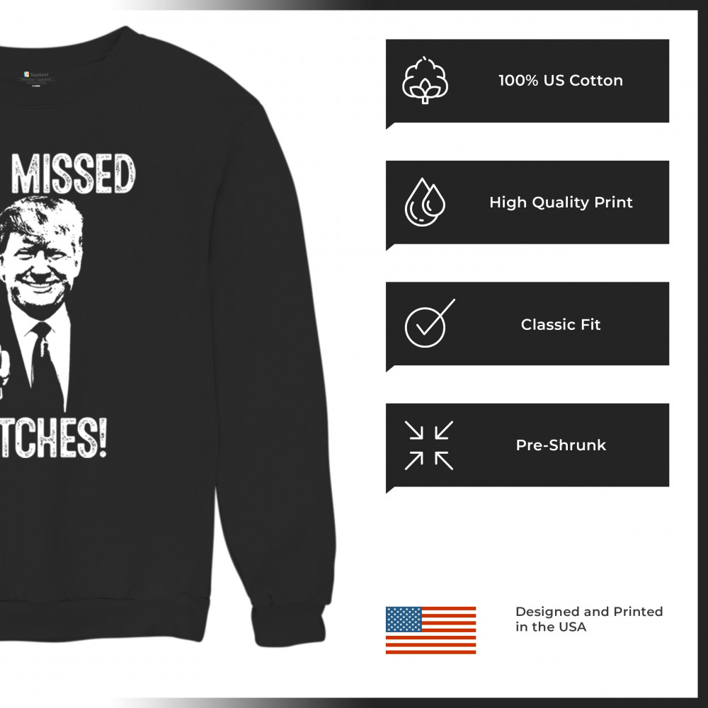 Commemorate Trump's resilience and determination with our bold "You Missed Bitches!" design. Show your support and patriotism.