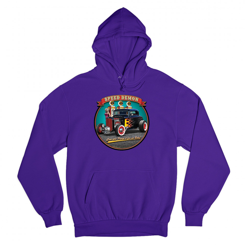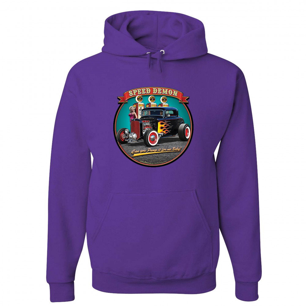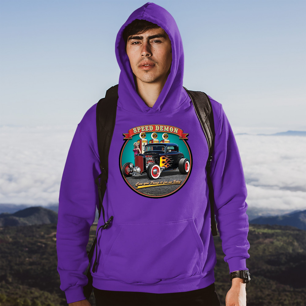 A print featuring a 1932 Ford Deuce hot rod coupe standing by a gas station. There is a cowgirl leaning on a gas pump. The print says: "speed demon" and underneath the car "Can you Pump it for me baby?". A great choice for Route 66 and hot rod fans.