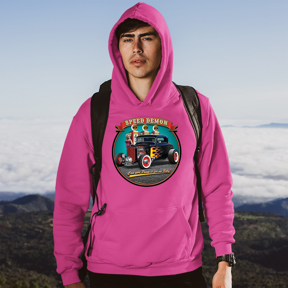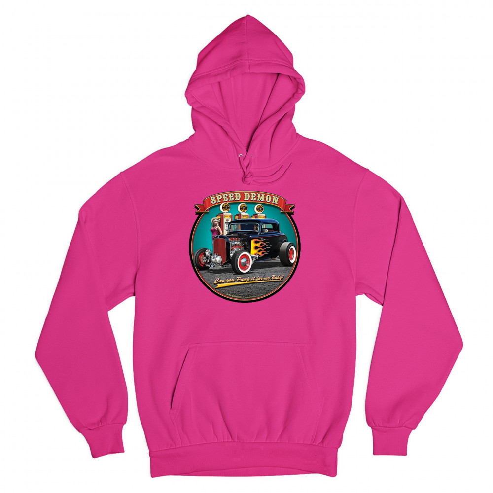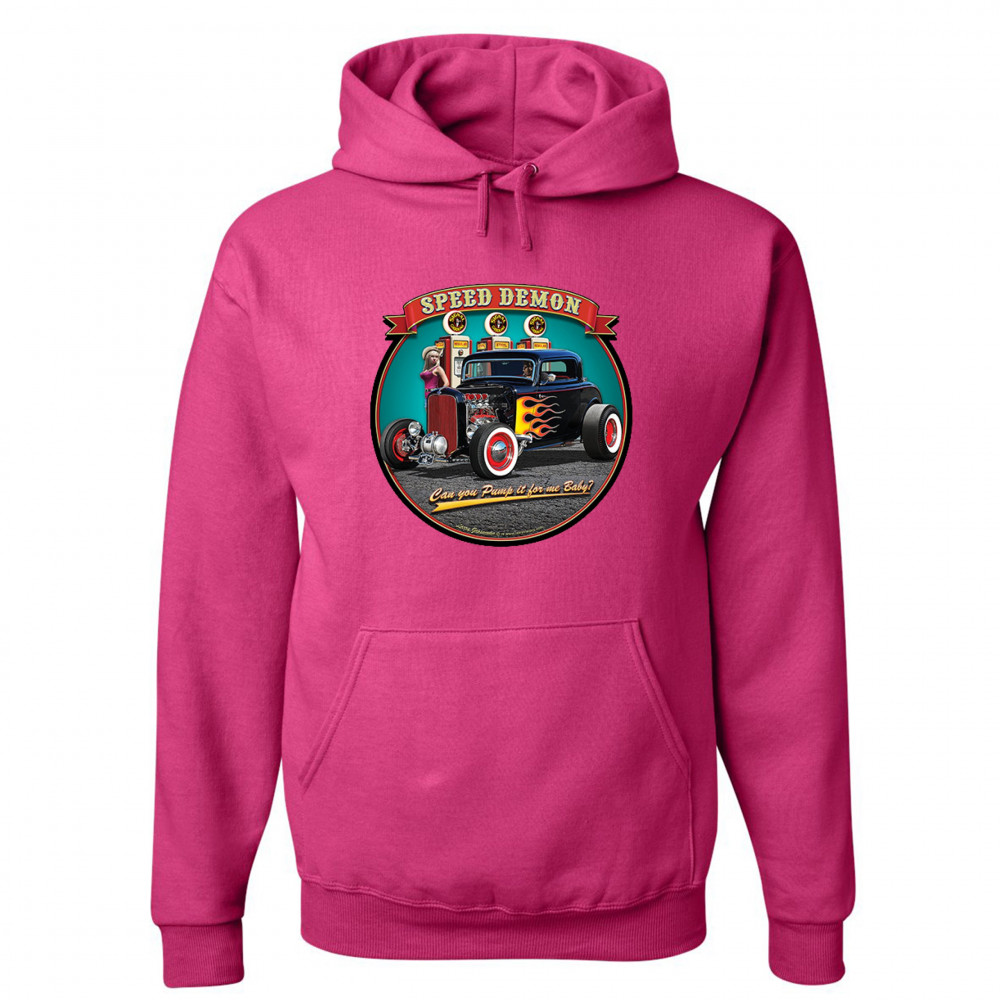 A print featuring a 1932 Ford Deuce hot rod coupe standing by a gas station. There is a cowgirl leaning on a gas pump. The print says: "speed demon" and underneath the car "Can you Pump it for me baby?". A great choice for Route 66 and hot rod fans.