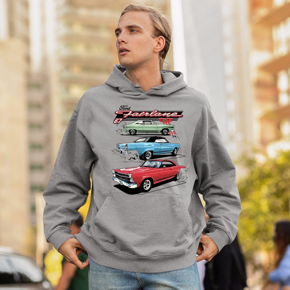 Celebrate the raw power of the 1967 Ford Fairlane GT with this burnout-charged design. Featuring three muscle cars in retro detail, it's made for vintage Ford collectors, classic car fans, and V8 enthusiasts. Whether you're heading to a show or wrenching in the garage, this design brings the roar of the 60s.