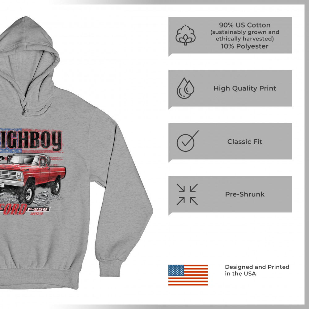 This vintage truck design features a 1971 Ford F-250 Highboy 4x4 with a classic lifted stance and patriotic flag background. Bold and nostalgic, it’s perfect for classic truck fans, 4x4 lovers, off-roaders, and collectors who appreciate American V8 tradition. Show it off at truck shows, meets, or cruise nights.