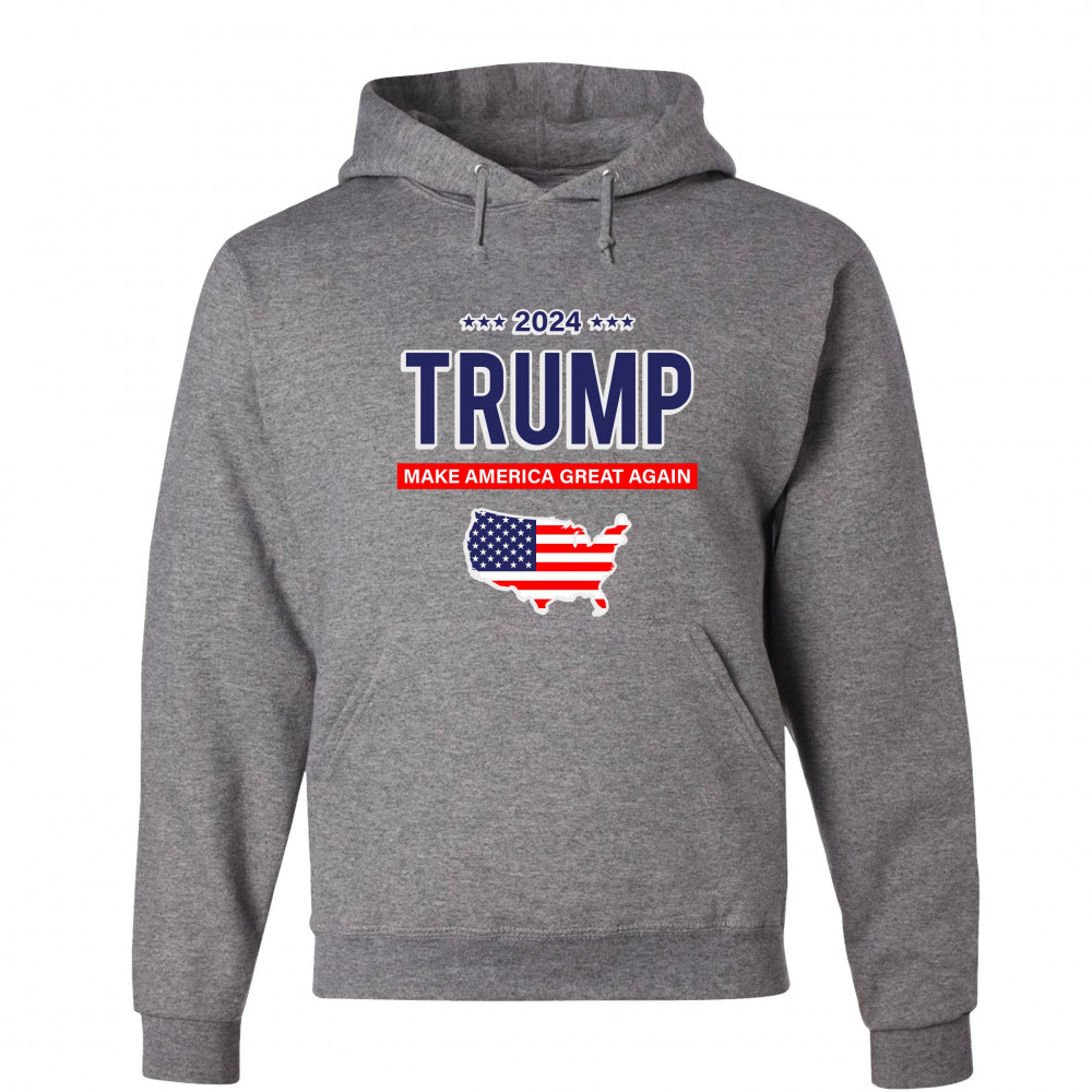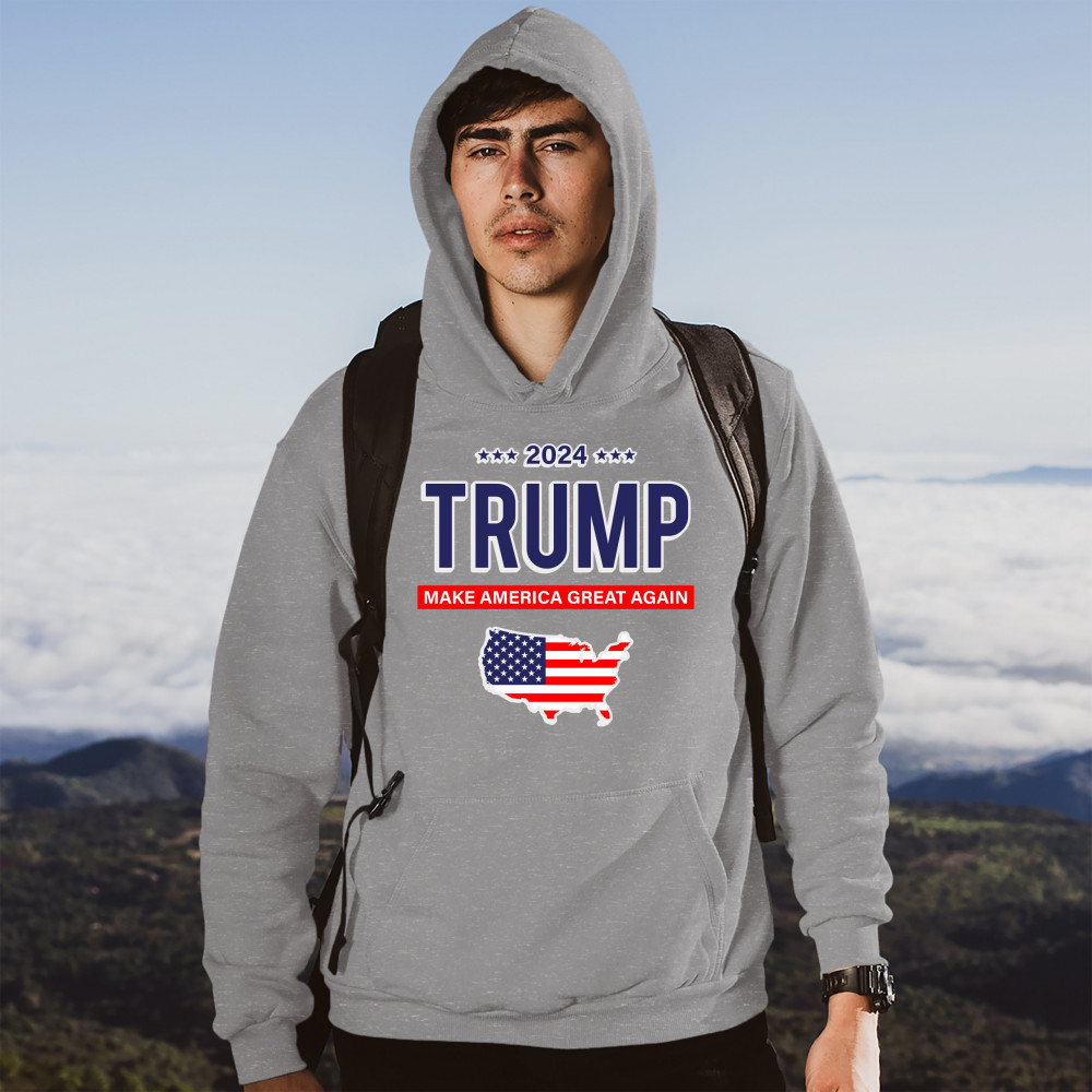 A political print saying "2024 Trump Make America Great Again" and features the silhouette of the USA with the American flag inside of it. A great choice to wear for a Trump rally or give as a gift to a Donald Trump supporter before 2024 presidential elec