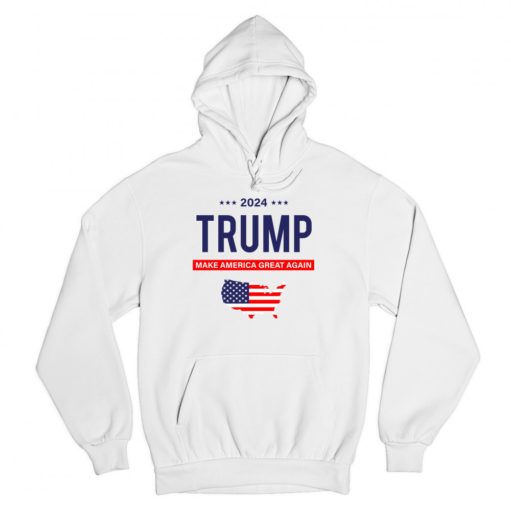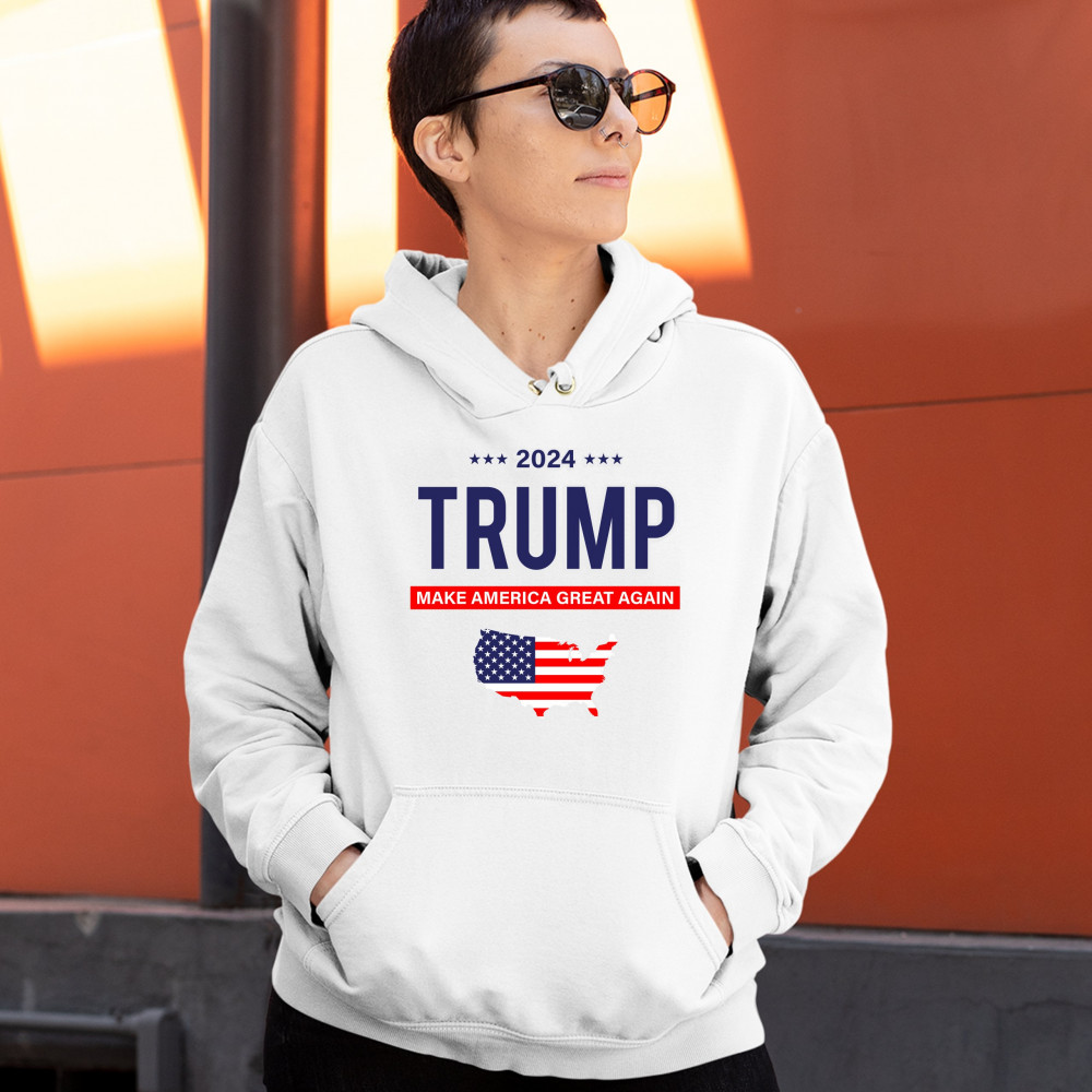 A political print saying "2024 Trump Make America Great Again" and features the silhouette of the USA with the American flag inside of it. A great choice to wear for a Trump rally or give as a gift to a Donald Trump supporter before 2024 presidential elec