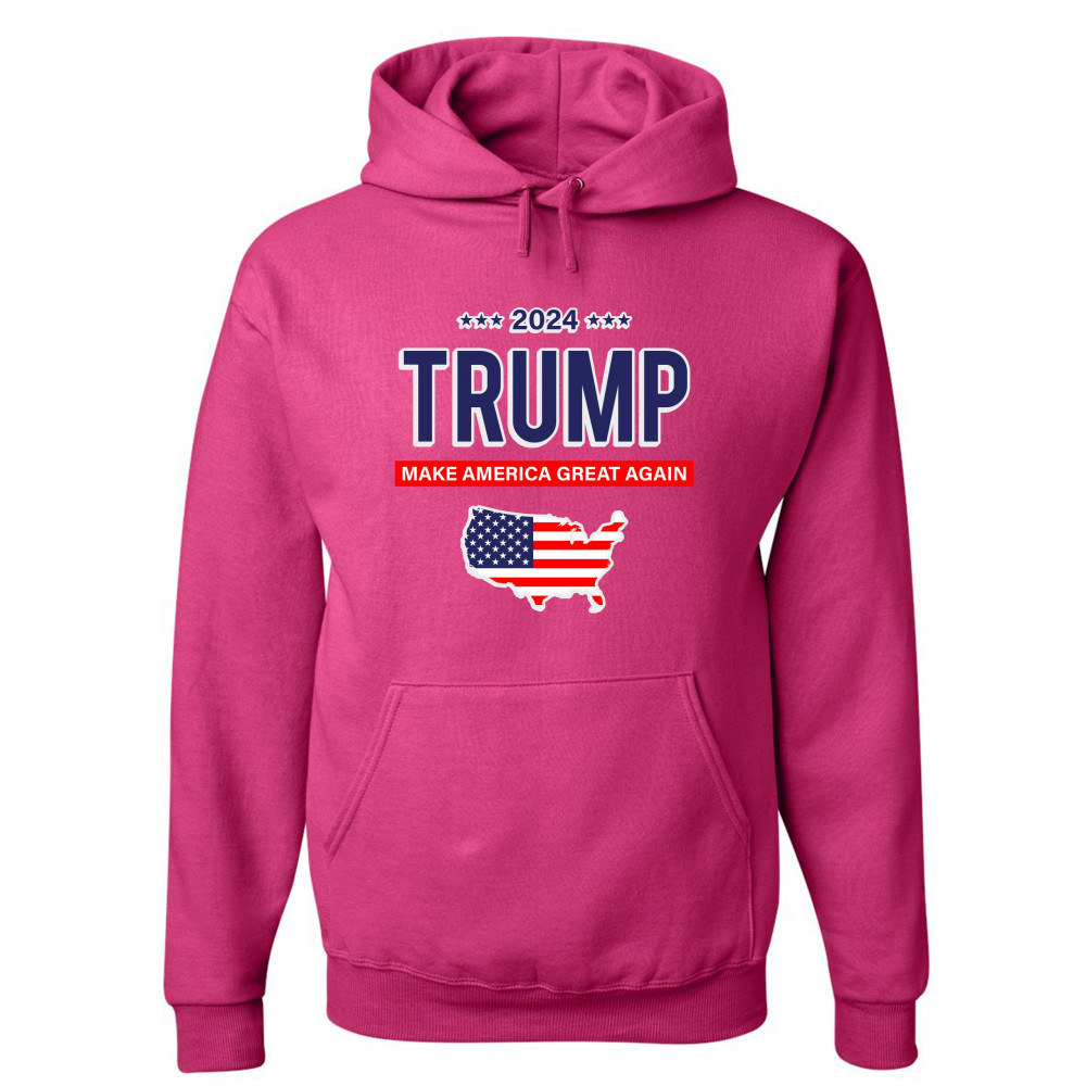 A political print saying "2024 Trump Make America Great Again" and features the silhouette of the USA with the American flag inside of it. A great choice to wear for a Trump rally or give as a gift to a Donald Trump supporter before 2024 presidential elec