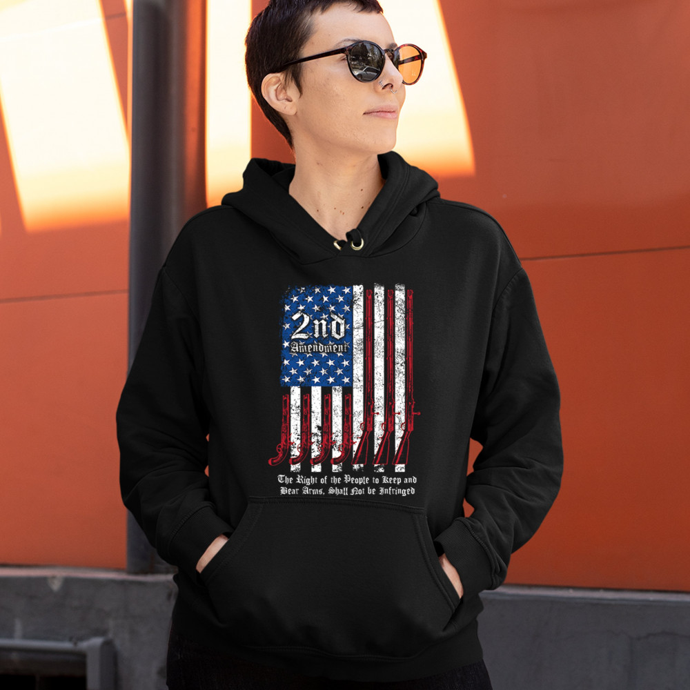 A print featuring a distressed American flag with pistols and muskets instead of red stripes. Atop of the 50 stars "2nd Amendment" is written. The print says: "The Right of the People to Keep and Bear Arms, Shall Not be Infringed ". Great choice for any g