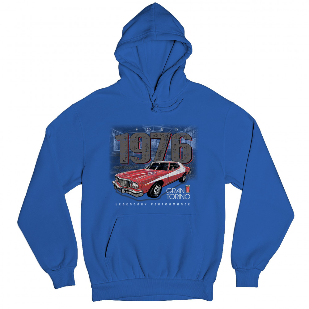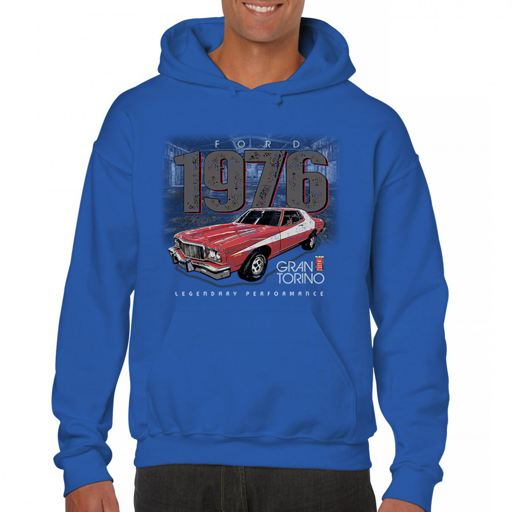 1976 Ford Gran Torino design with red and white retro style. Perfect for muscle car fans, Ford lovers, and classic car event gear.