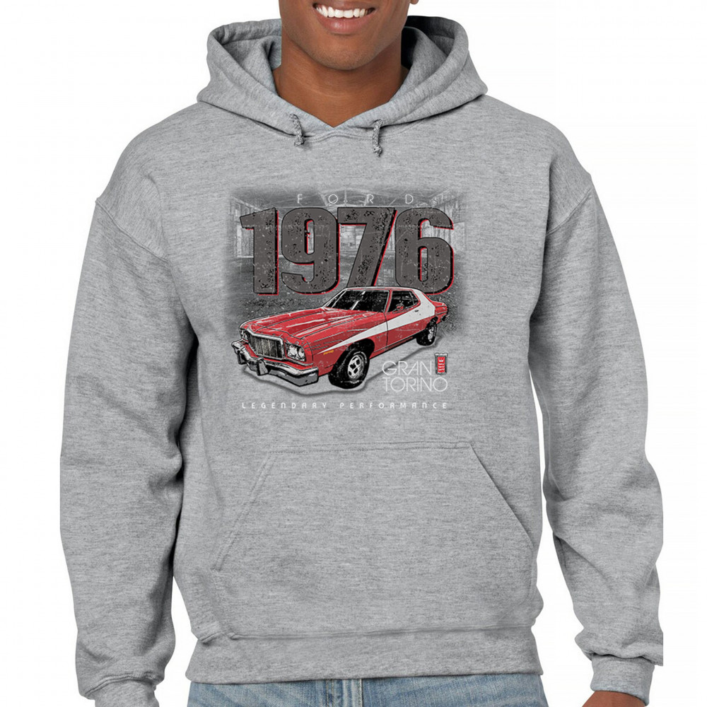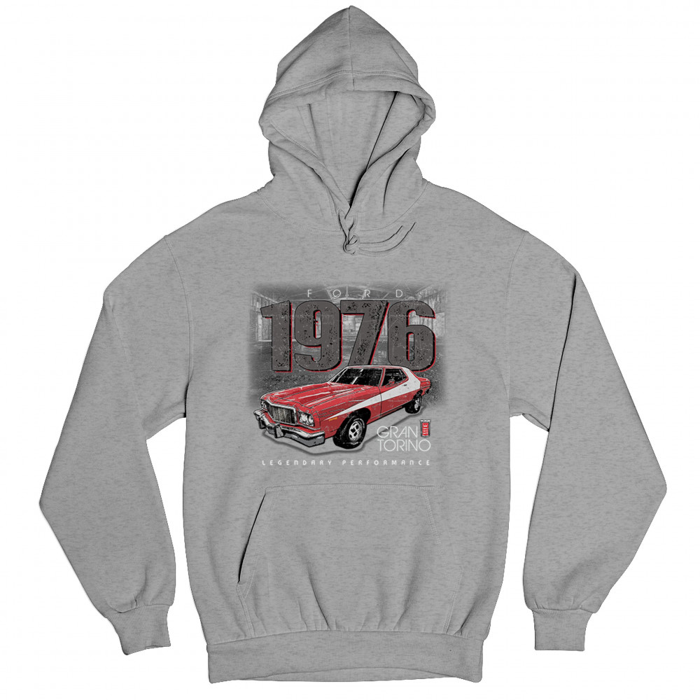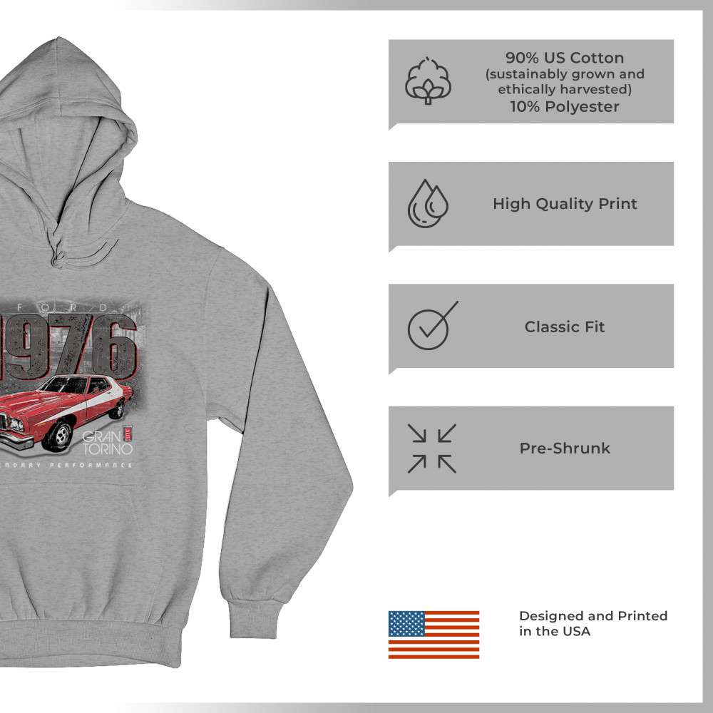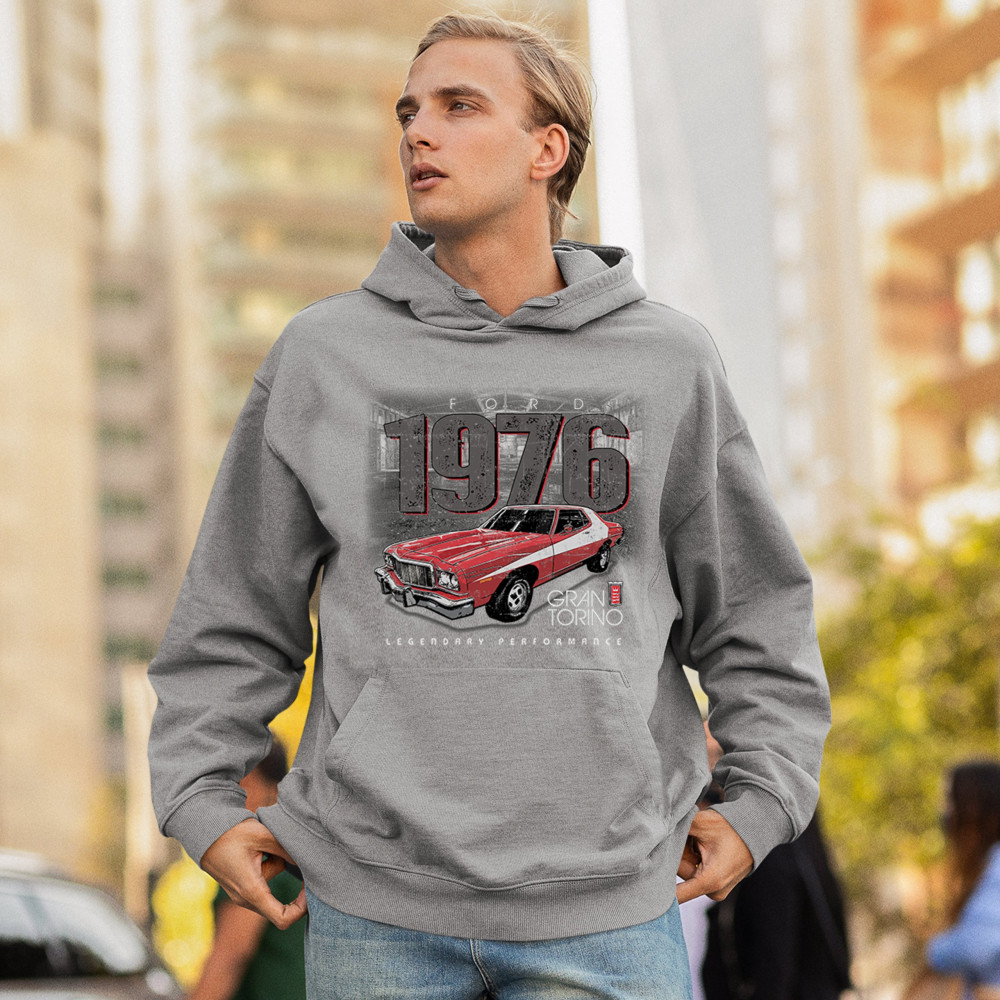 1976 Ford Gran Torino design with red and white retro style. Perfect for muscle car fans, Ford lovers, and classic car event gear.