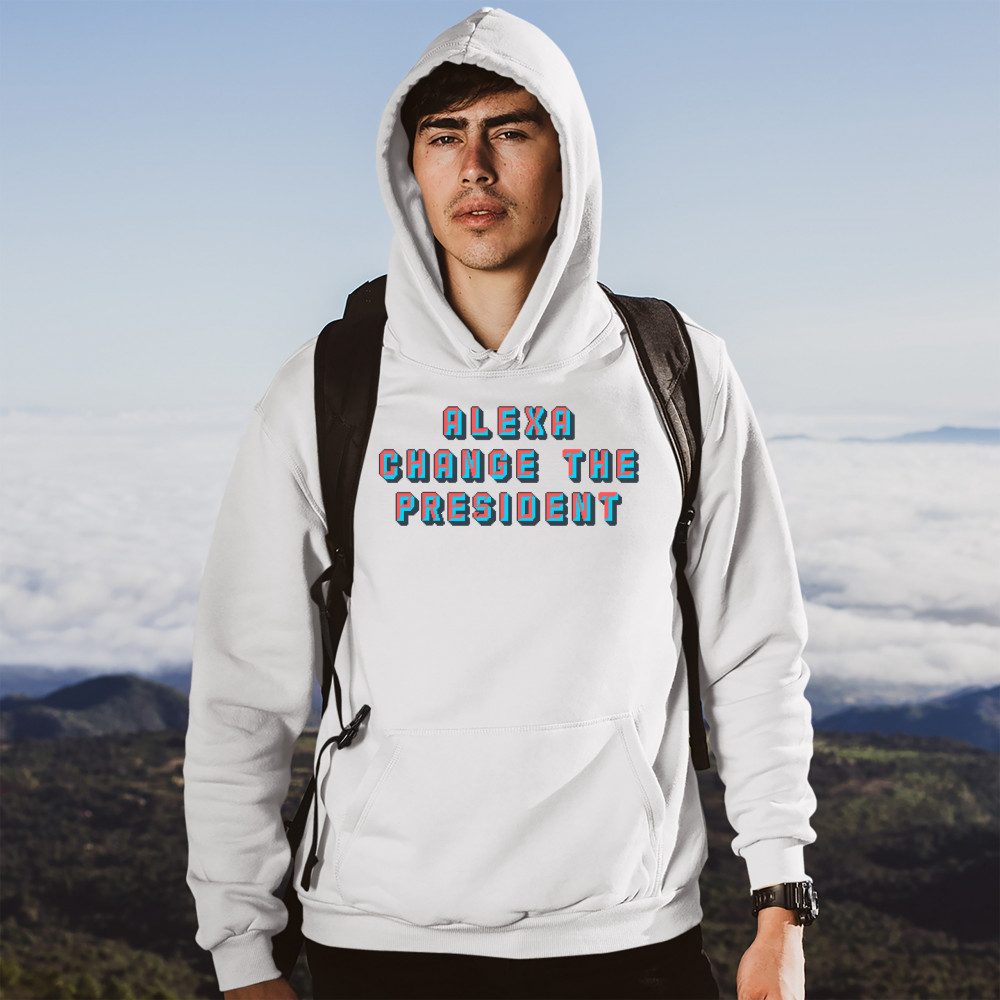 A print saying "Alexa Change the President". A great choice to wear to a Trump rally or give as a gift to a Donald Trump supporter before 2024 presidential elections.