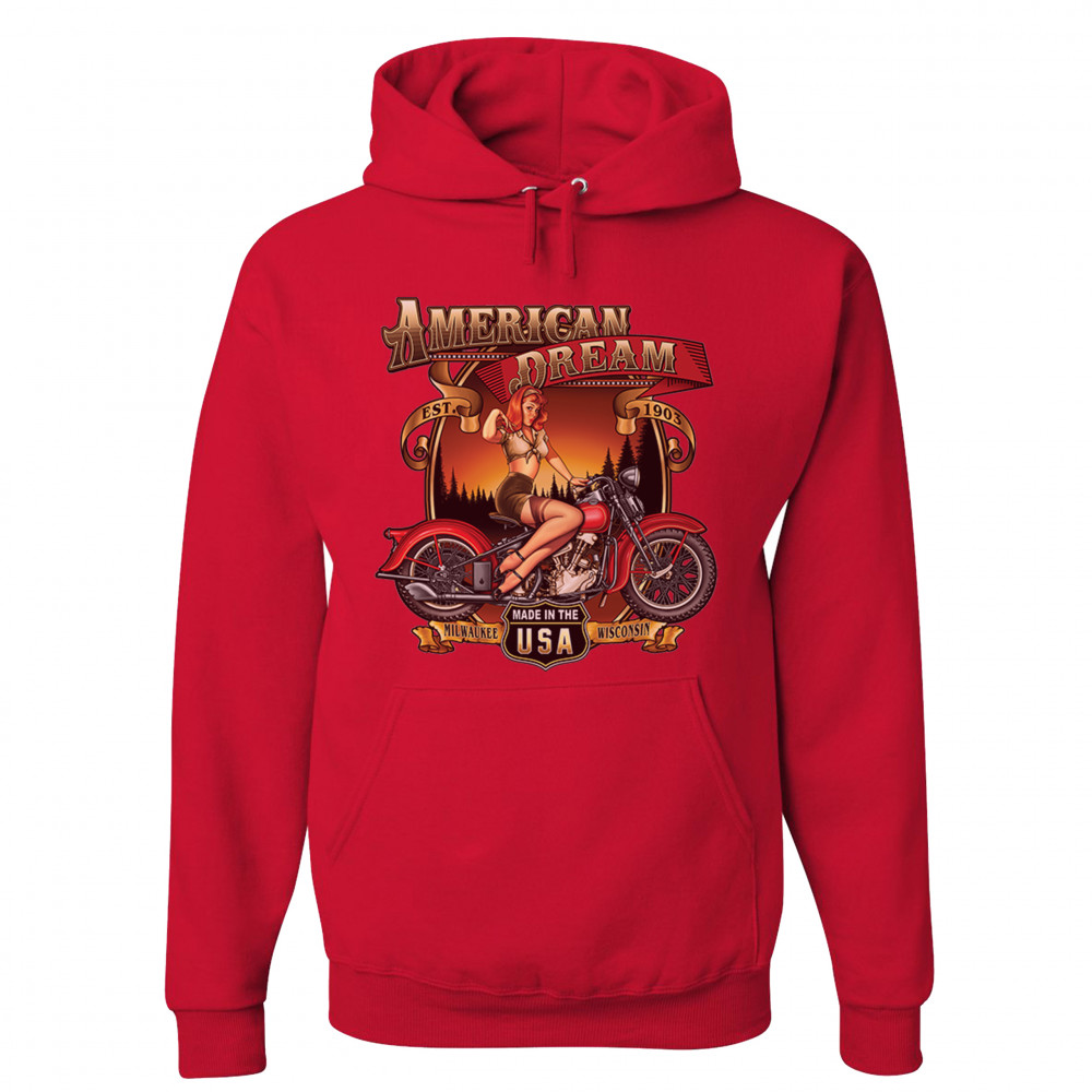 A print featuring a sexy pin up girl sitting on a vintage motorcycle. The print says: "American Dream est. 1903". In the bottom there is a sign saying: "made in the USA". To the left and right of it "Milwaukee Wisconsin" is written on a stripe. Great choice for any motorcycle enthusiast.