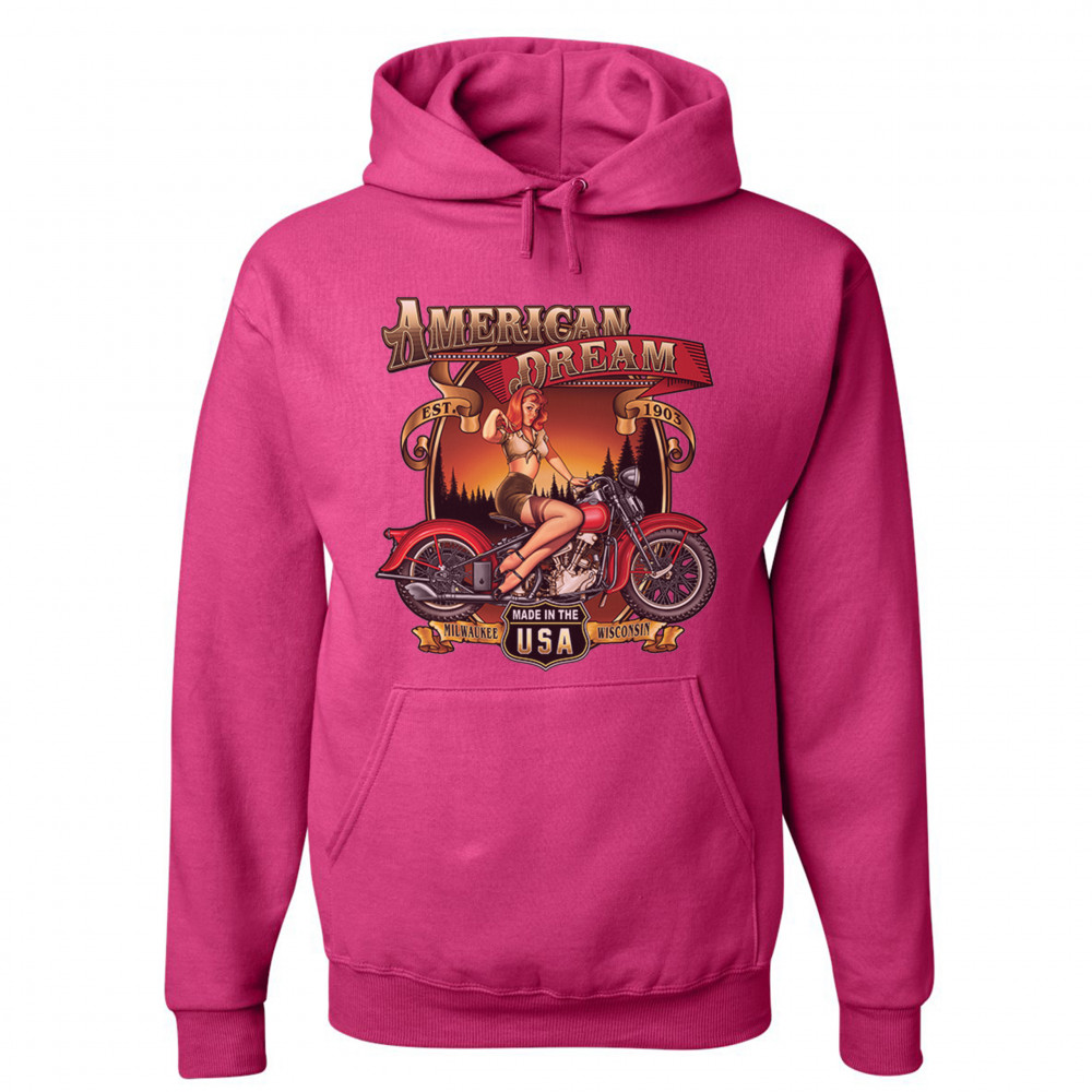 A print featuring a sexy pin up girl sitting on a vintage motorcycle. The print says: "American Dream est. 1903". In the bottom there is a sign saying: "made in the USA". To the left and right of it "Milwaukee Wisconsin" is written on a stripe. Great choice for any motorcycle enthusiast.