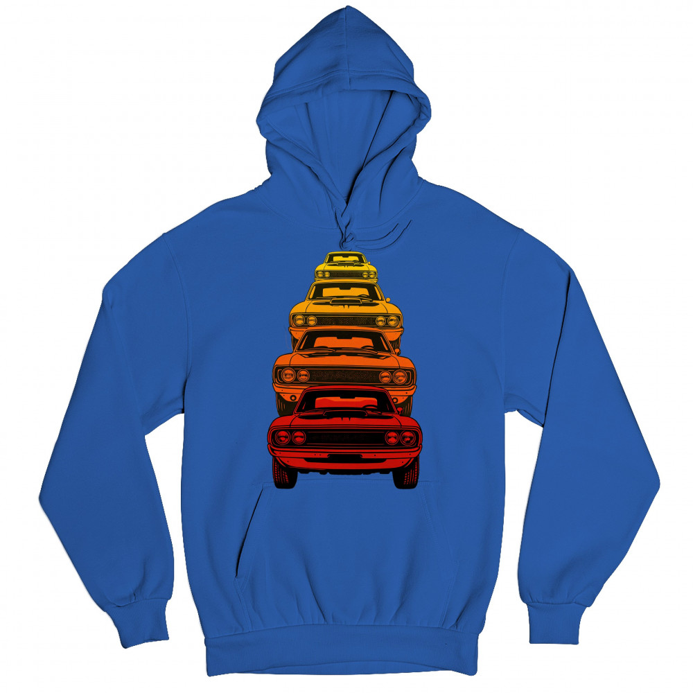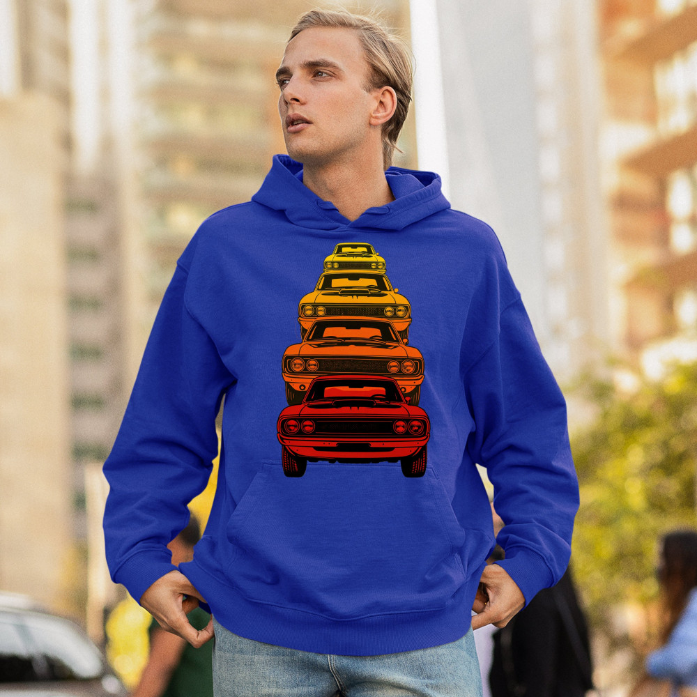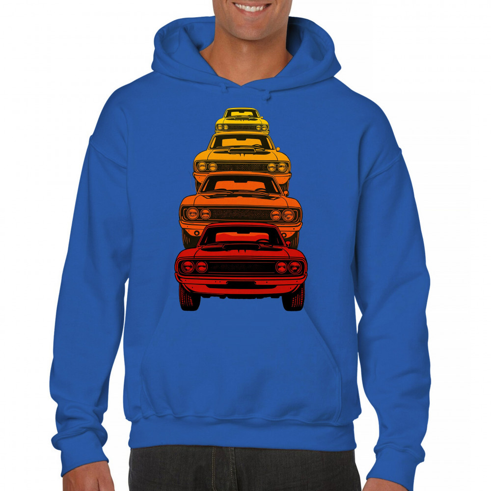 Celebrate horsepower heritage with this colorful lineup of classic muscle cars. Featuring a stacked gradient from red to yellow, this design brings bold retro attitude, V8 pride, and American torque to life. Perfect for collectors, gearheads, and fans of classic car power.