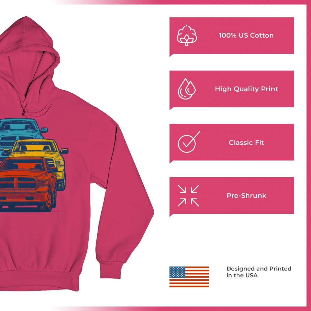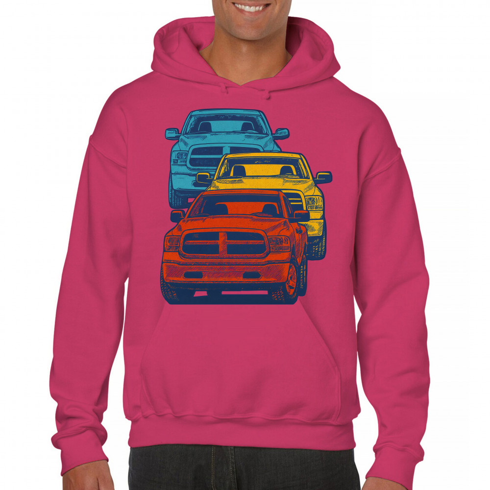 Bold stacked pickup truck design in red yellow blue. Great for lifted truck fans, gearheads, off-road events, and diesel-powered pride.
