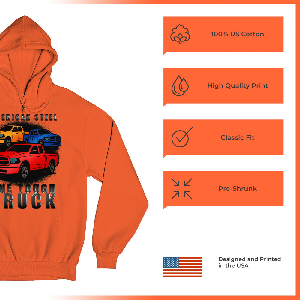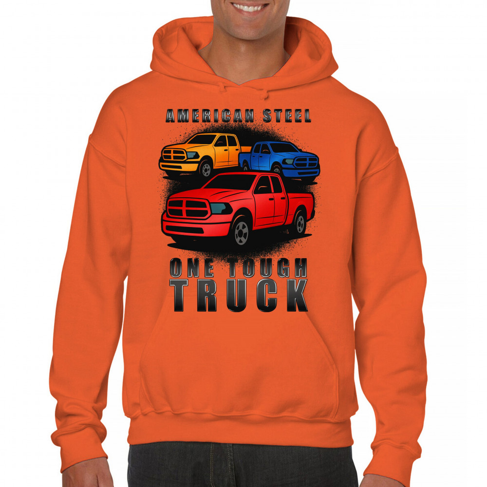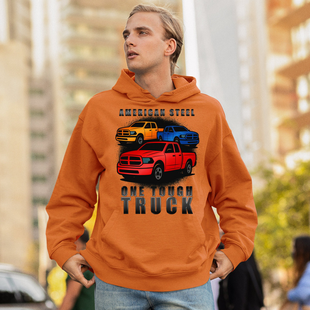 Bold truck design with red, yellow, and blue pickups. Built for fans of American steel, tough performance, and road warrior pride.