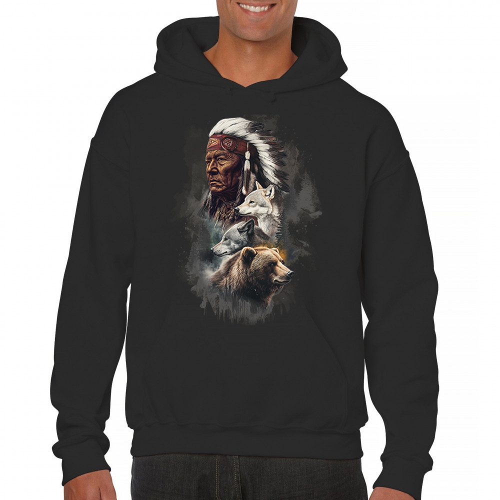 Celebrate spiritual strength and heritage with this design featuring a Native American elder alongside wolves and a bear. This tribal and totemic art reflects wisdom, guardianship, and deep forest spirit energy. Perfect for cultural pride, animal lovers, and those connected to spiritual symbolism in nature.