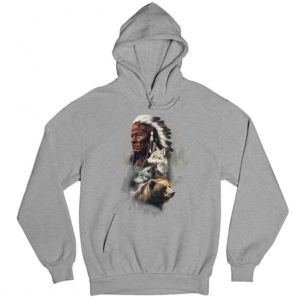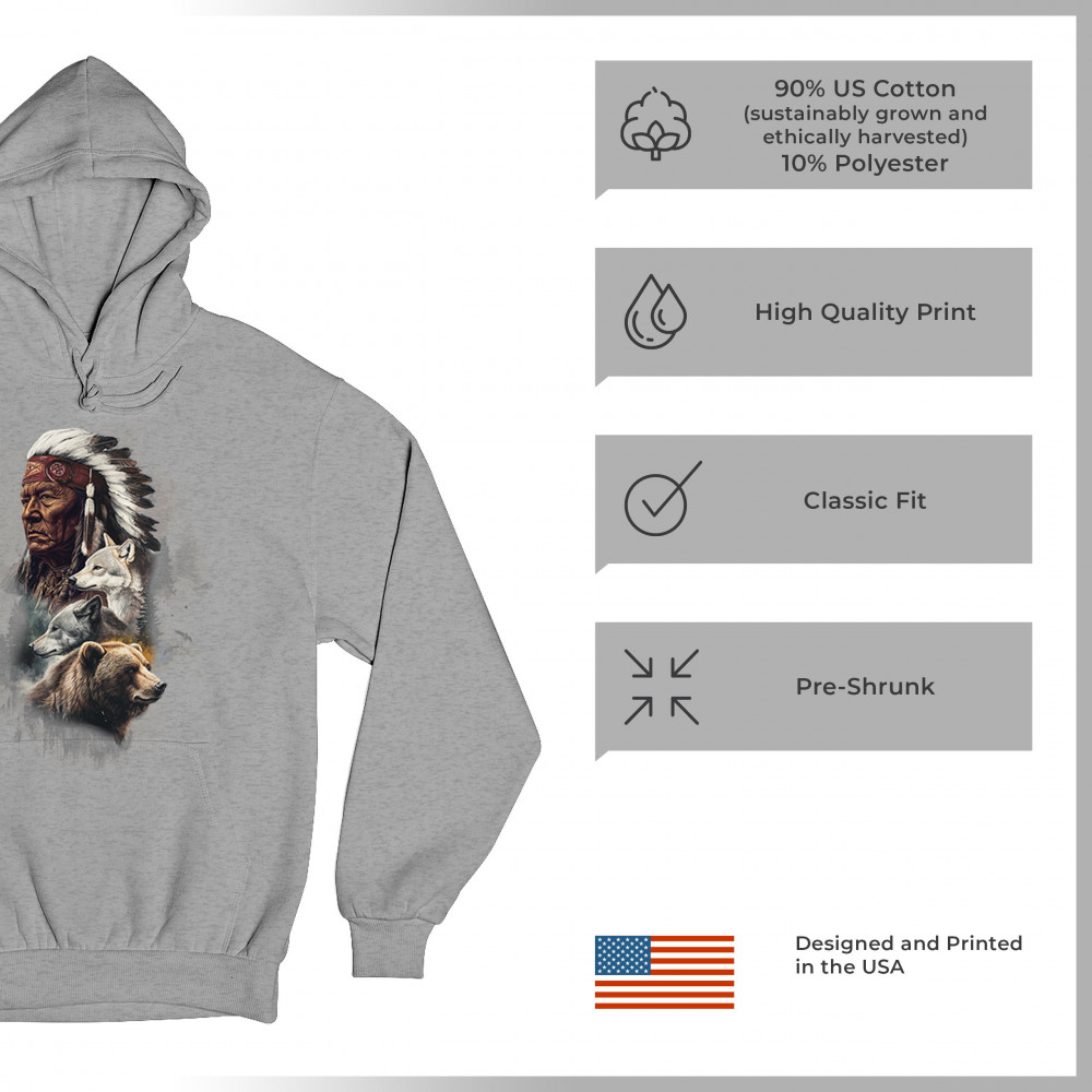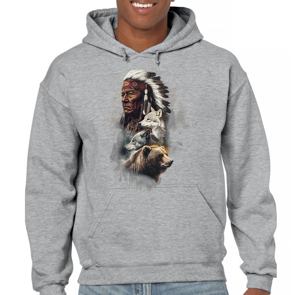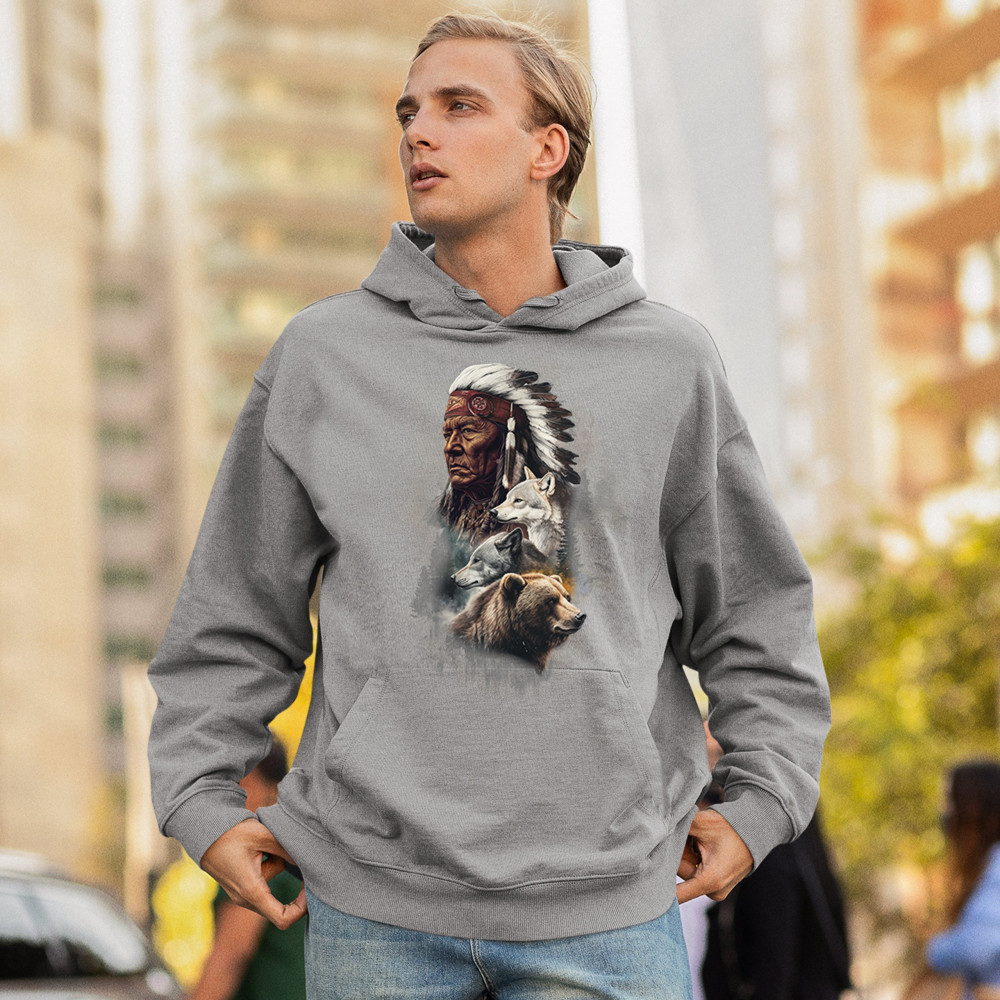 Celebrate spiritual strength and heritage with this design featuring a Native American elder alongside wolves and a bear. This tribal and totemic art reflects wisdom, guardianship, and deep forest spirit energy. Perfect for cultural pride, animal lovers, and those connected to spiritual symbolism in nature.