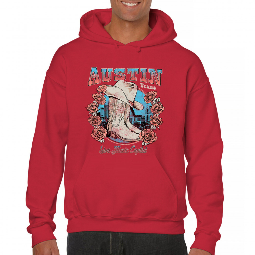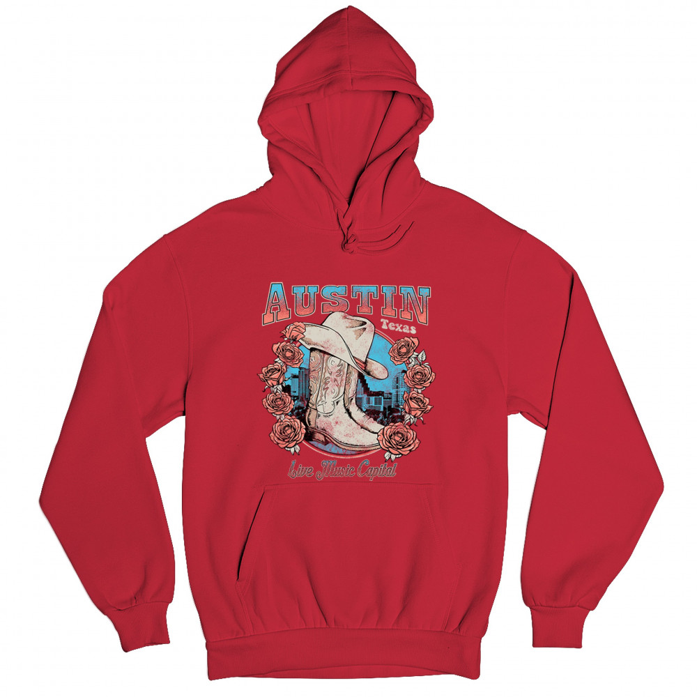 Austin TX Live Music Capital comes alive in this vintage cowgirl boots and hat design, accented by roses and the city skyline. Perfect for lovers of country music, honkytonk vibes, and western chic, this design embodies southern spirit, rustic grit, and the proud Americana aesthetic of Texas’ iconic music scene.
