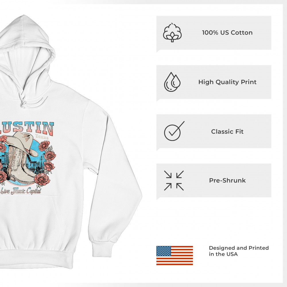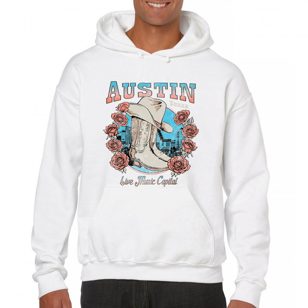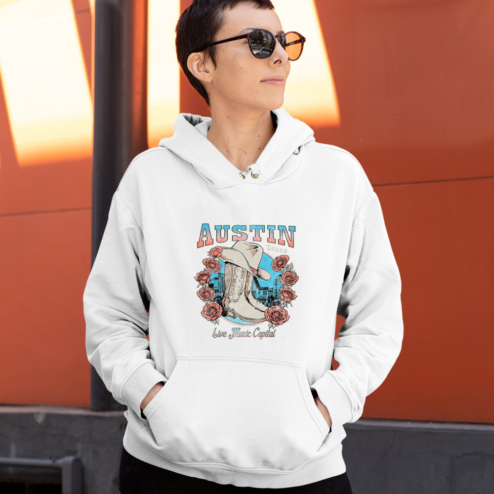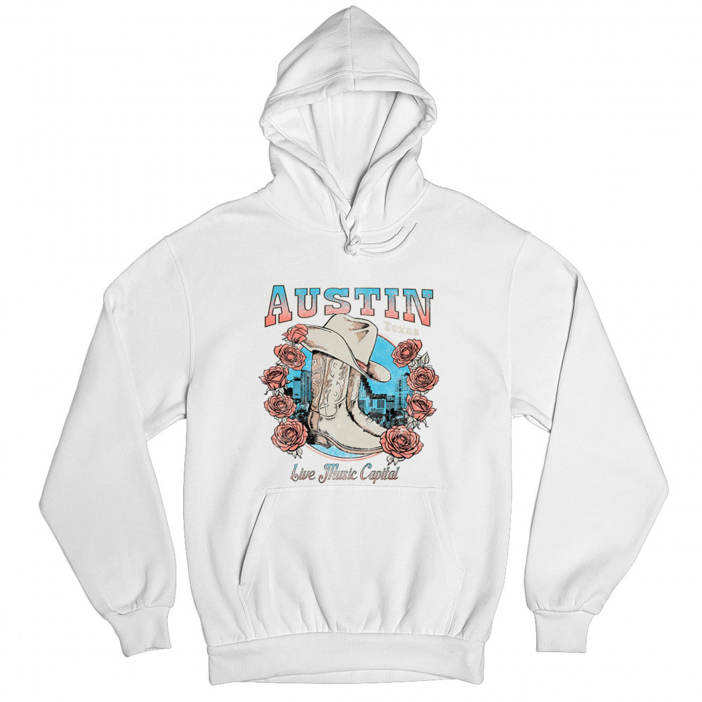 Austin TX Live Music Capital comes alive in this vintage cowgirl boots and hat design, accented by roses and the city skyline. Perfect for lovers of country music, honkytonk vibes, and western chic, this design embodies southern spirit, rustic grit, and the proud Americana aesthetic of Texas’ iconic music scene.