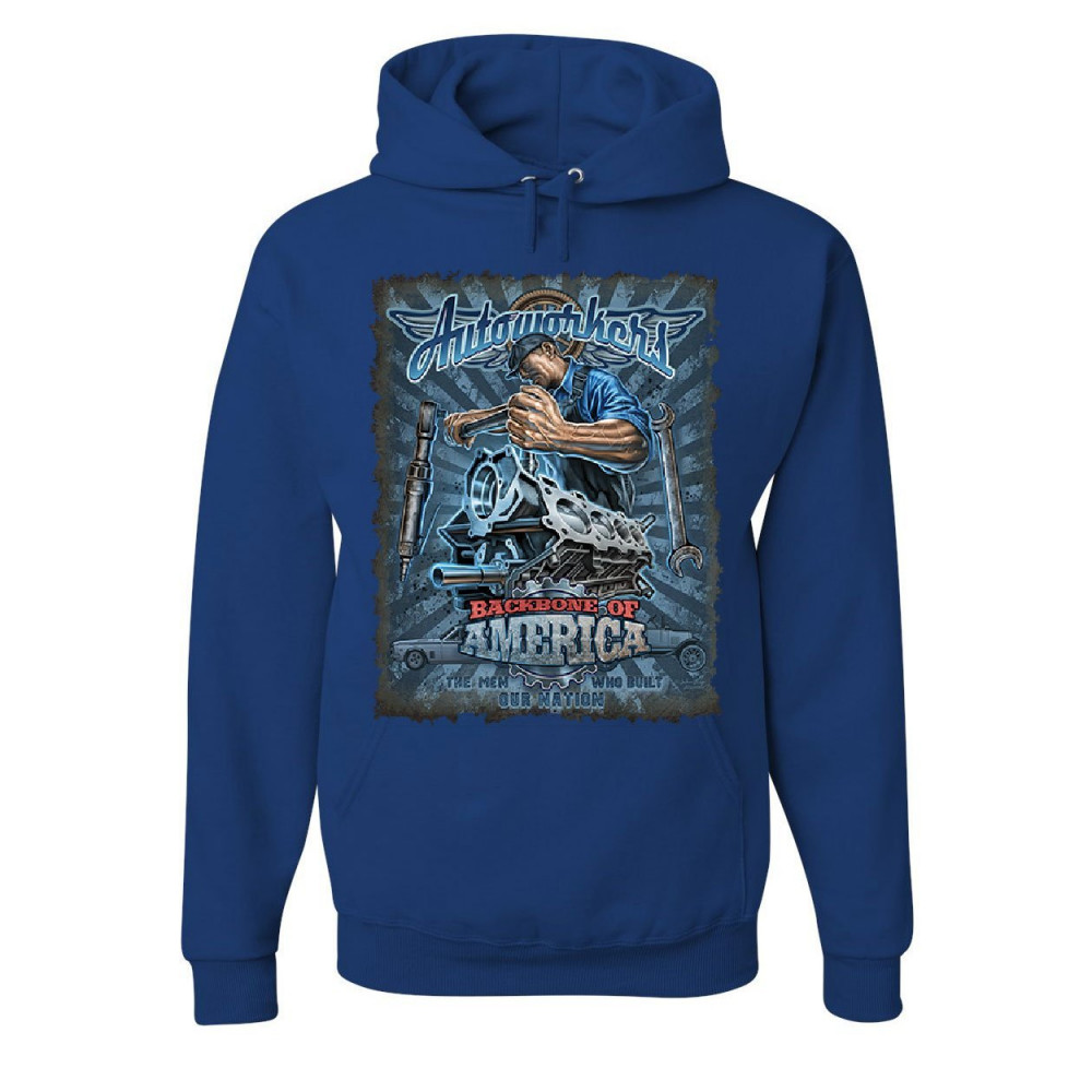 AUTOWORKERS - BACKBONE OF AMERICA autoworkers backbone of america hoodie car motor mechanic union sweatshirt royal blue