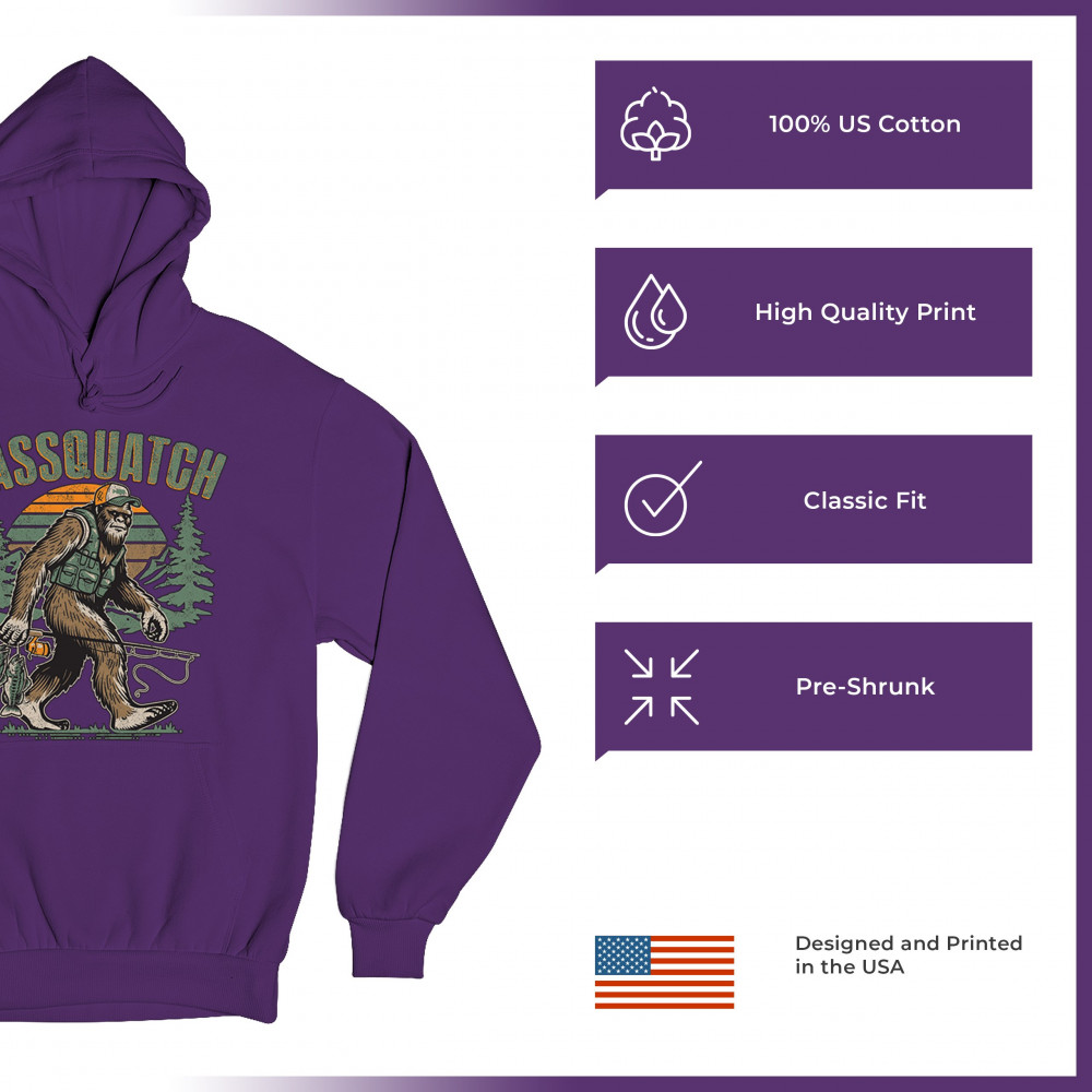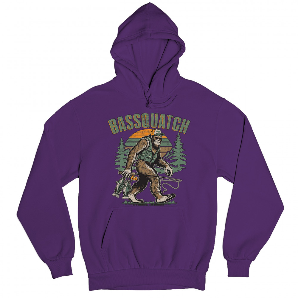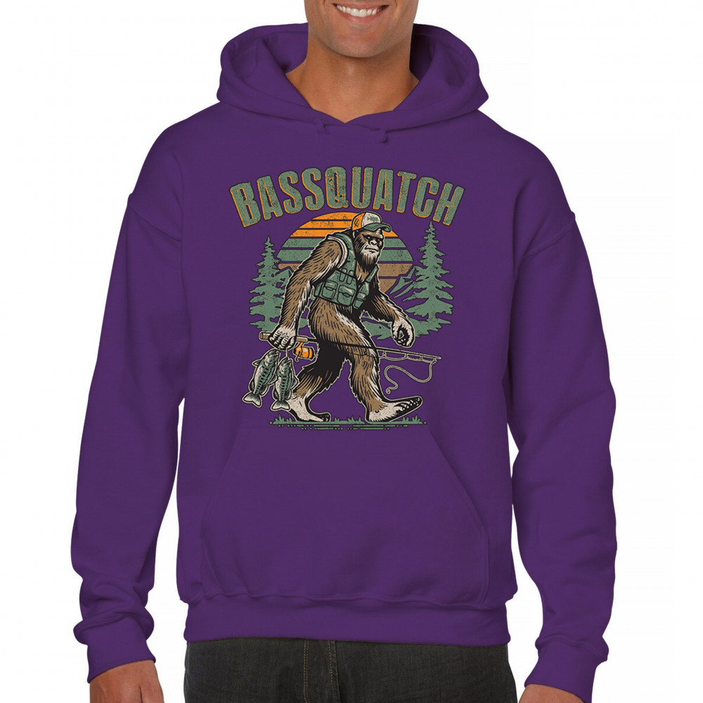 Funny Bassquatch design blends Bigfoot, fishing humor, and retro forest style. Great for anglers, cryptid lovers, and outdoorsy pun fans.